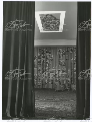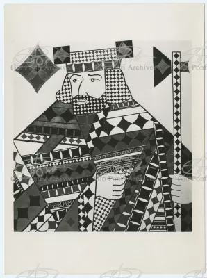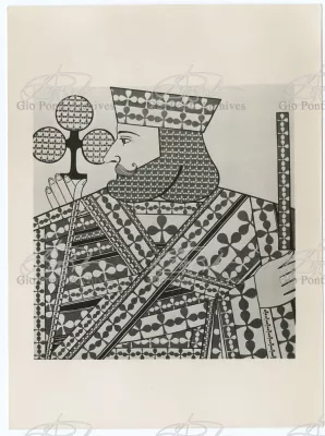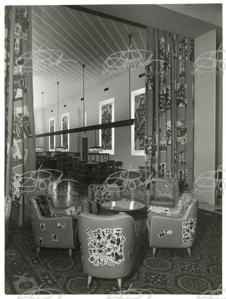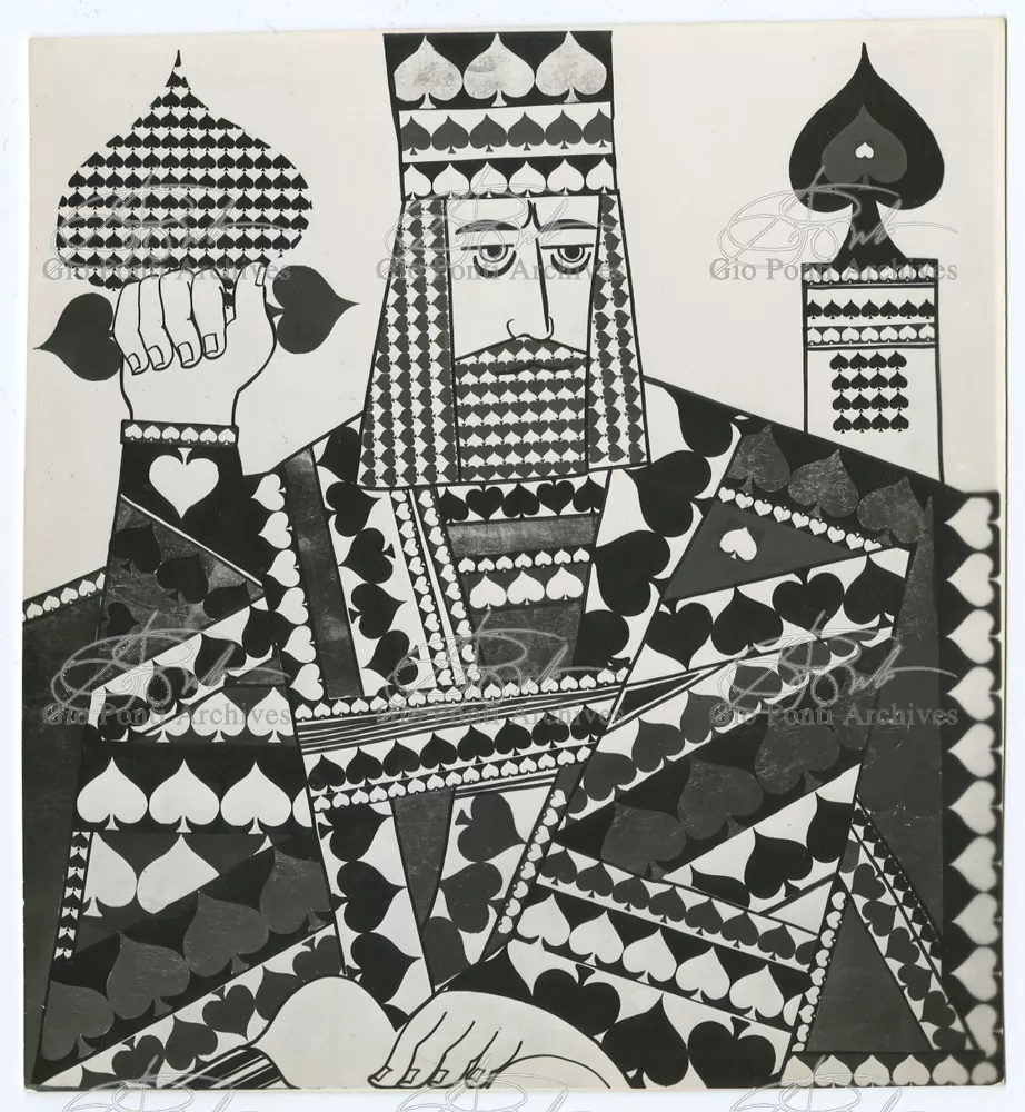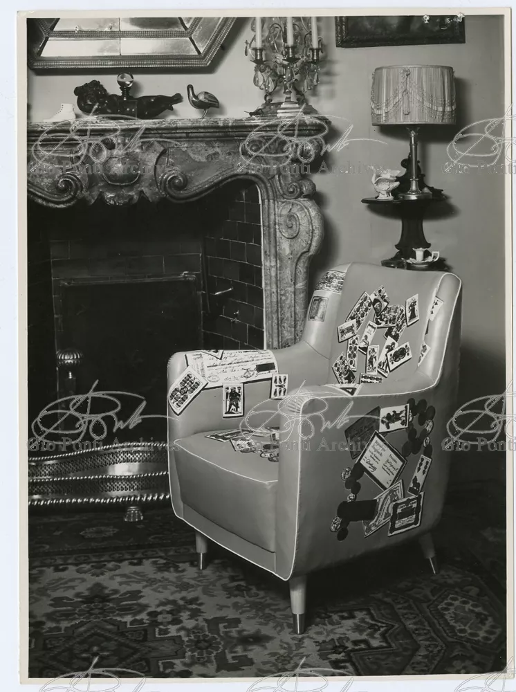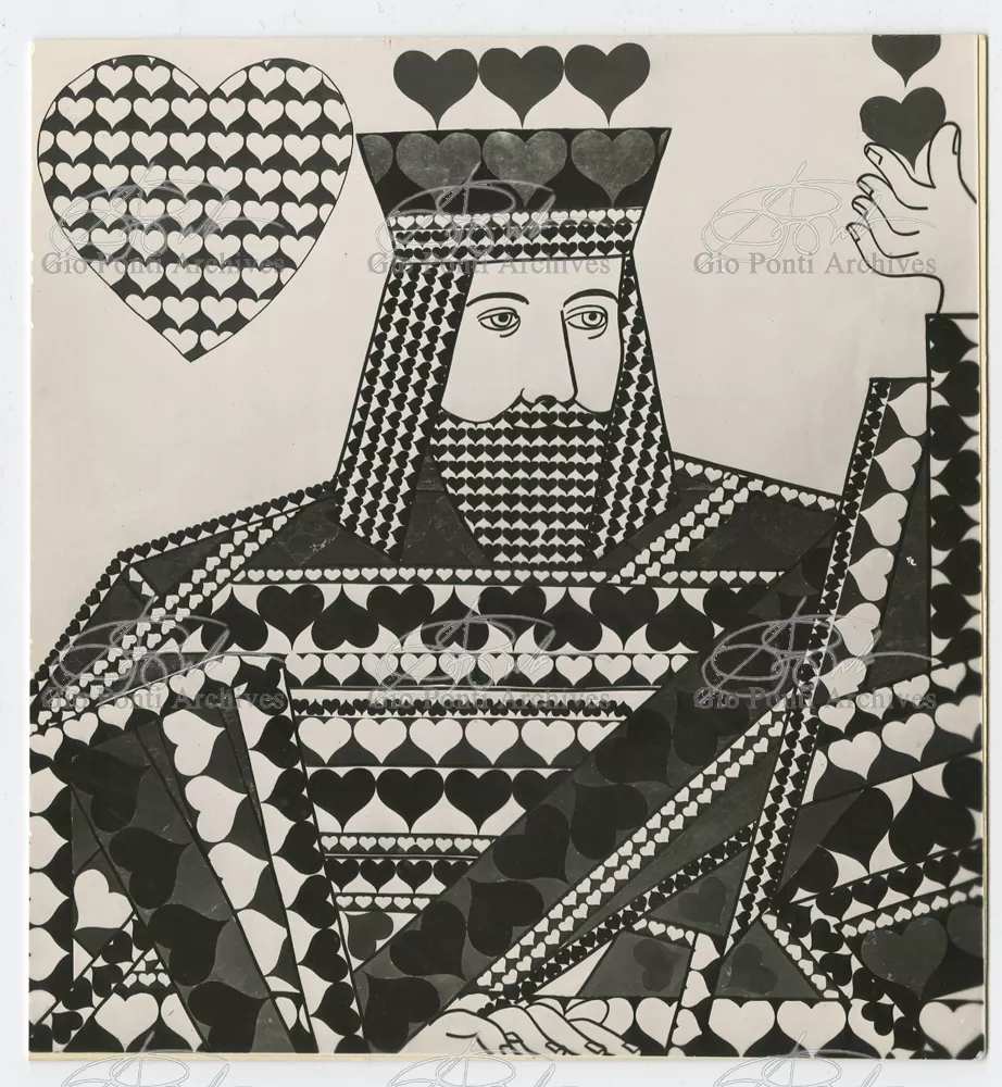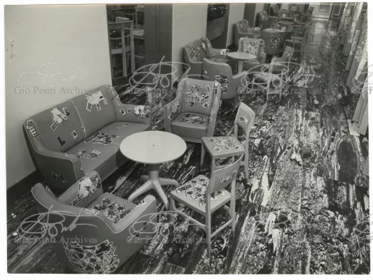 Ponti-Fornasetti amusements would flourish in the fifties in many ways. After the first black and white decorations (on the walls of the Dulciora shop and on the fronts of Ponti's neoclassical trumeaux), Fornasetti turned now to colour, stamping with colored images (hundreds of them) all the surfaces of Ponti's rooms and pieces. In the Casino rooms in San Remo, designed by Ponti, Fornasetti imprinted small and giant playing-cards, hundreds of them, on sofas, armchairs, curtains, ceilings and walls (on the walls and ceilings the flying cards are set in luminous cavities). In the Vembi-Burroughs offices in Genoa and Turin, designed by Ponti, Fornasetti imprinted pens, pencils, sheets of paper, computers, on chairs, armchairs and sofas.