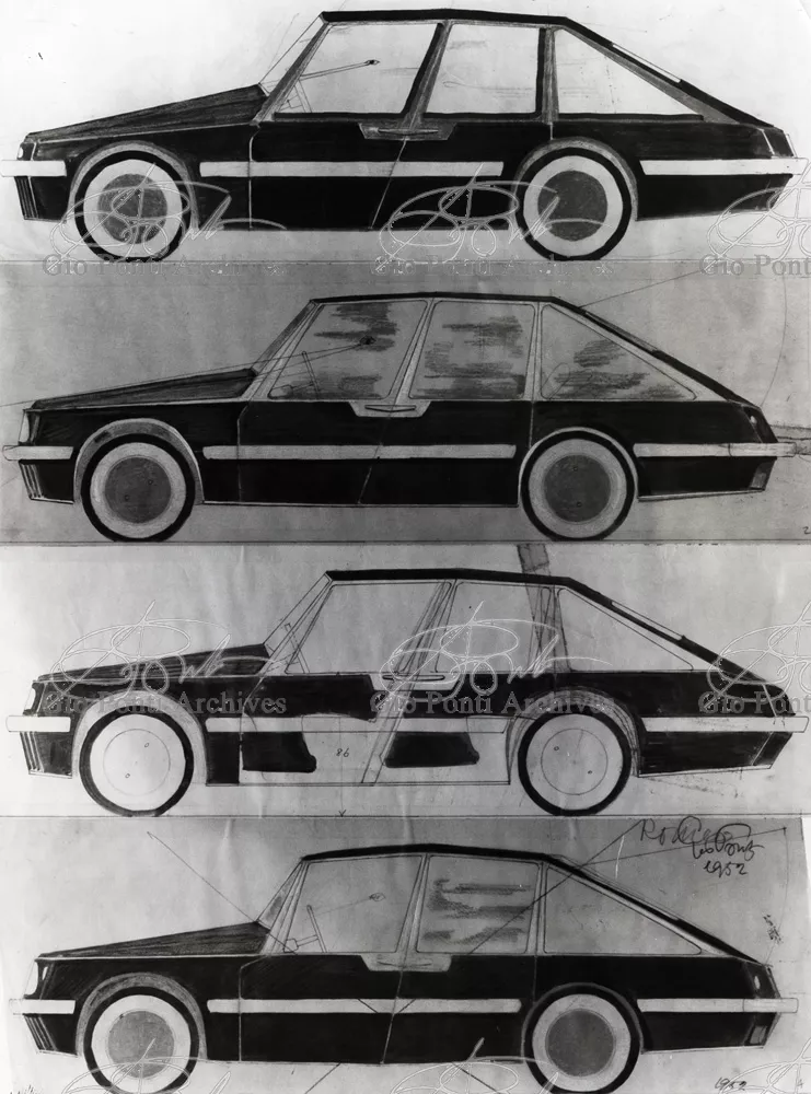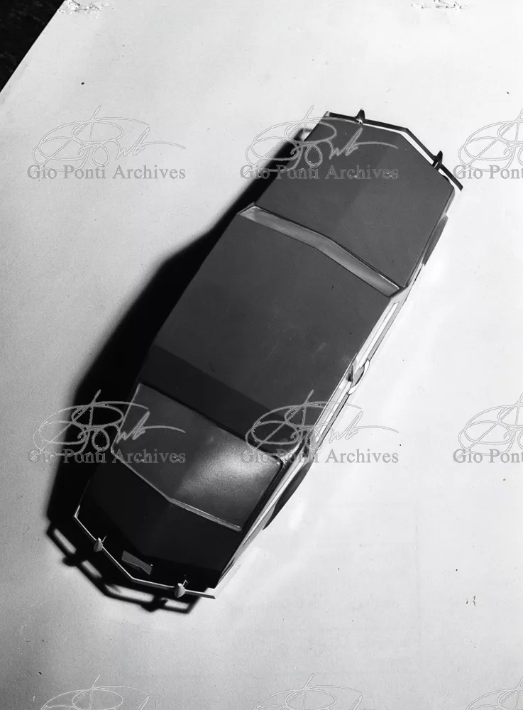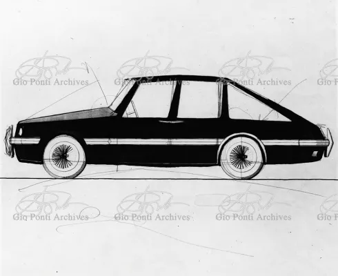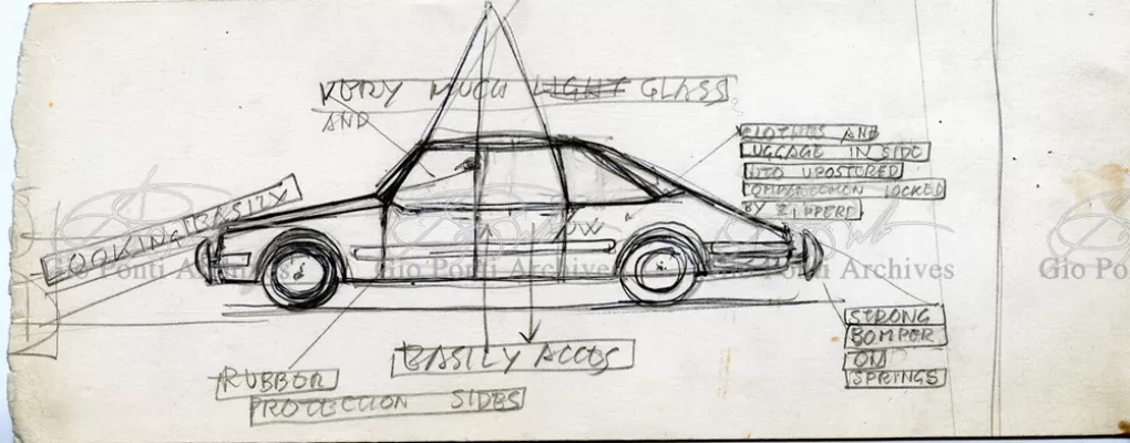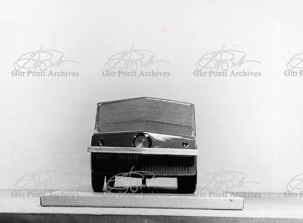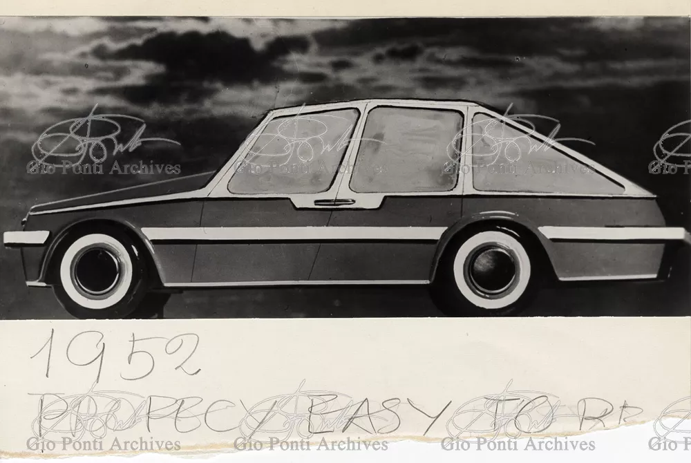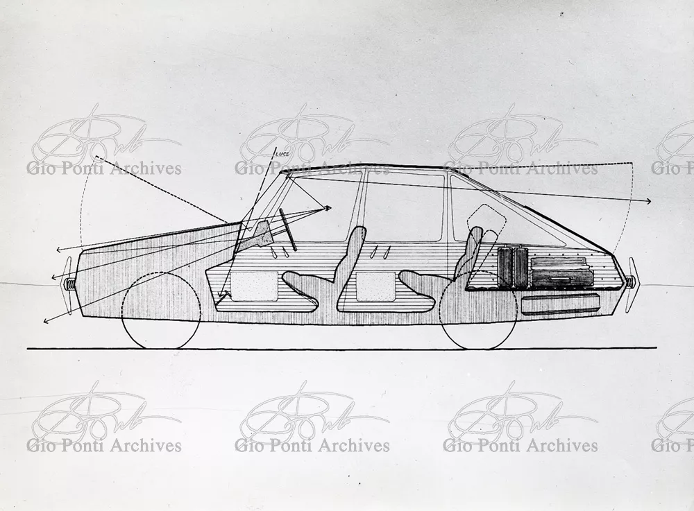 Gio Ponti had devised this form in reaction to the cars of that time, swollen, full of empty spaces, (borax, as Edgar Kaufmann used to say) with very high radiators, tiny windows, and dark interiors. It was a form ahead of its time: the body sheets are flat, not curved stiffened with folds and not ribs; the hood is low, the windows are very large, the back seats are adjustable like in airplanes, as people used to say at the time, the trunk is extremely capacious, accessible from the inside and separate from the spare wheel housing; the interior is spacious, bright, and filled with pockets. One innovation: the bumper made of rubber (provided with spring buffers at front and rear) that runs right round the car.
