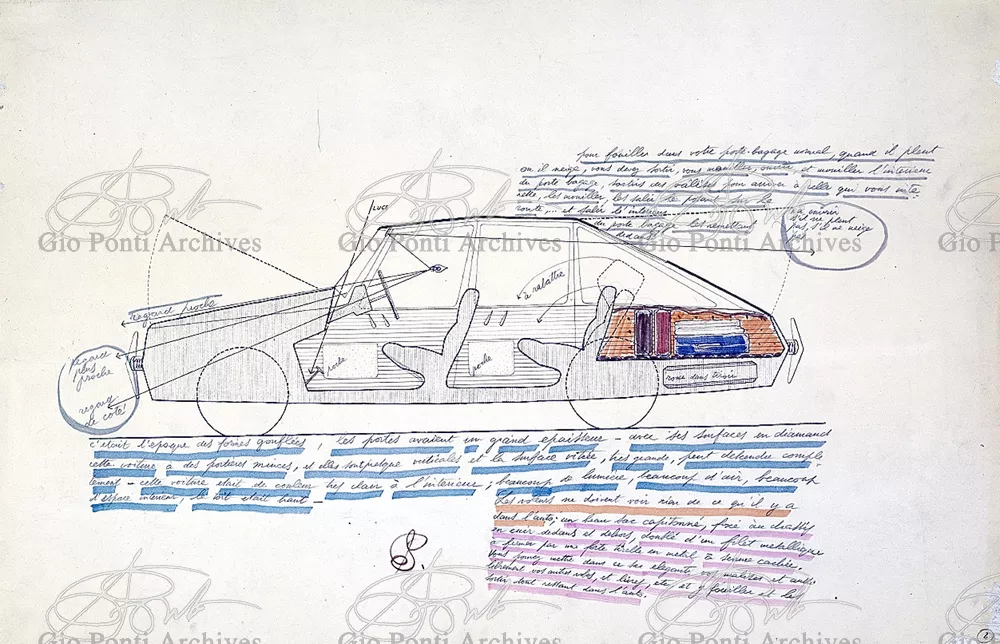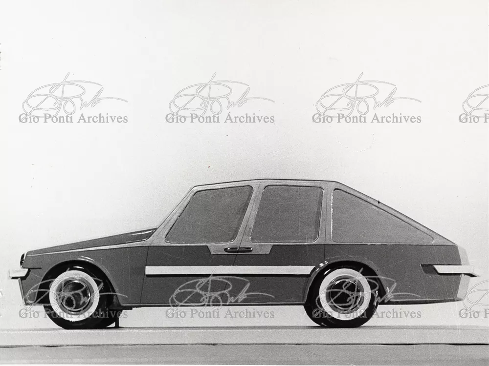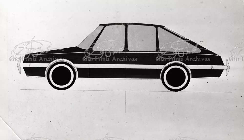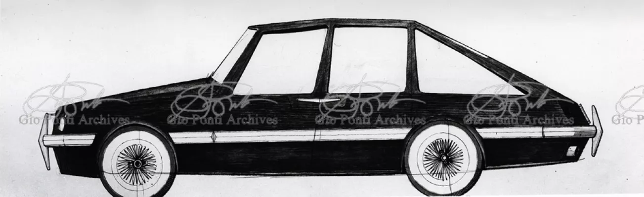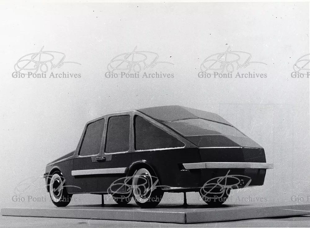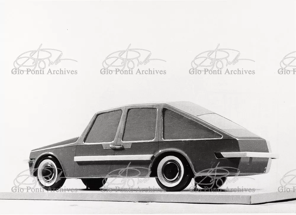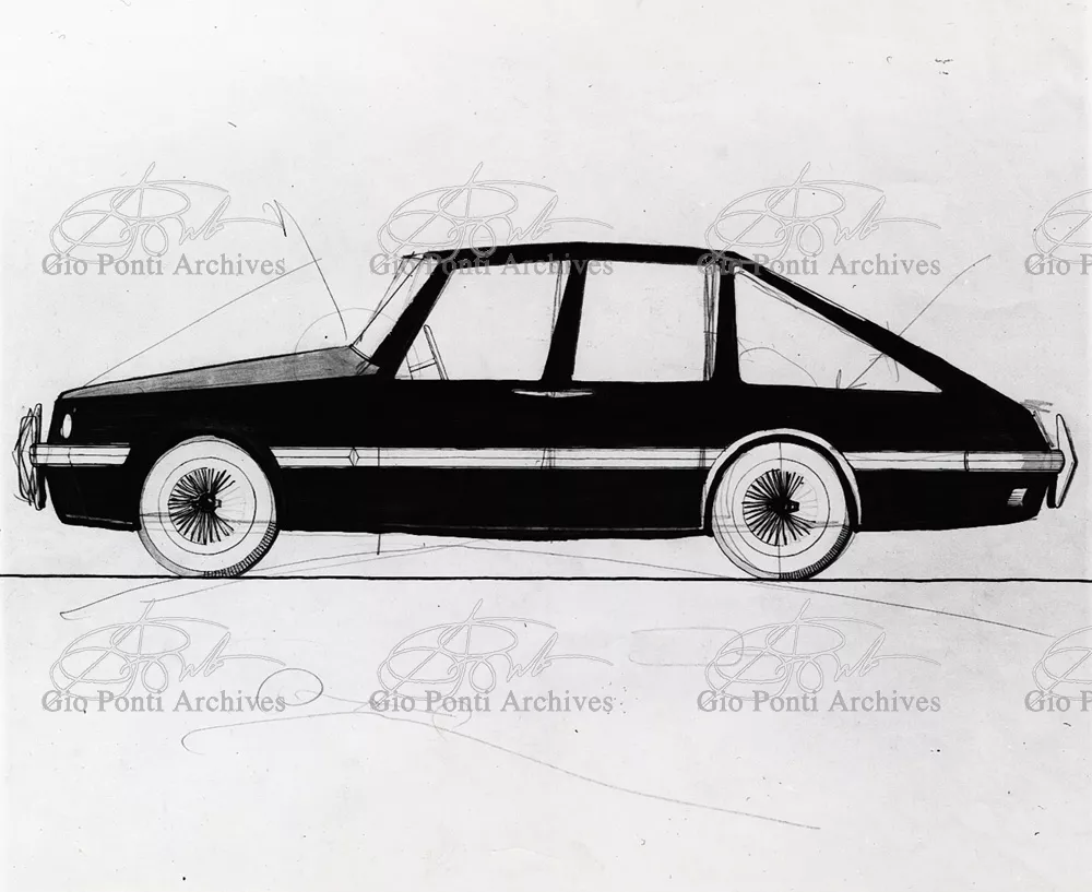Gio Ponti had devised this form in reaction to the cars of that time, swollen, full of empty spaces, (borax, as Edgar Kaufmann used to say) with very high radiators, tiny windows, and dark interiors. It was a form ahead of its time: the body sheets are flat, not curved stiffened with folds and not ribs; the hood is low, the windows are very large, the back seats are adjustable like in airplanes, as people used to say at the time, the trunk is extremely capacious, accessible from the inside and separate from the spare wheel housing; the interior is spacious, bright, and filled with pockets. One innovation: the bumper made of rubber (provided with spring buffers at front and rear) that runs right round the car.