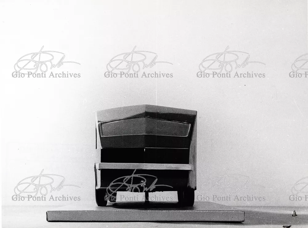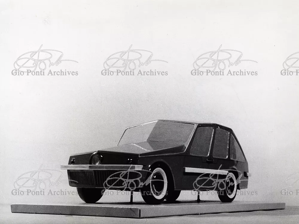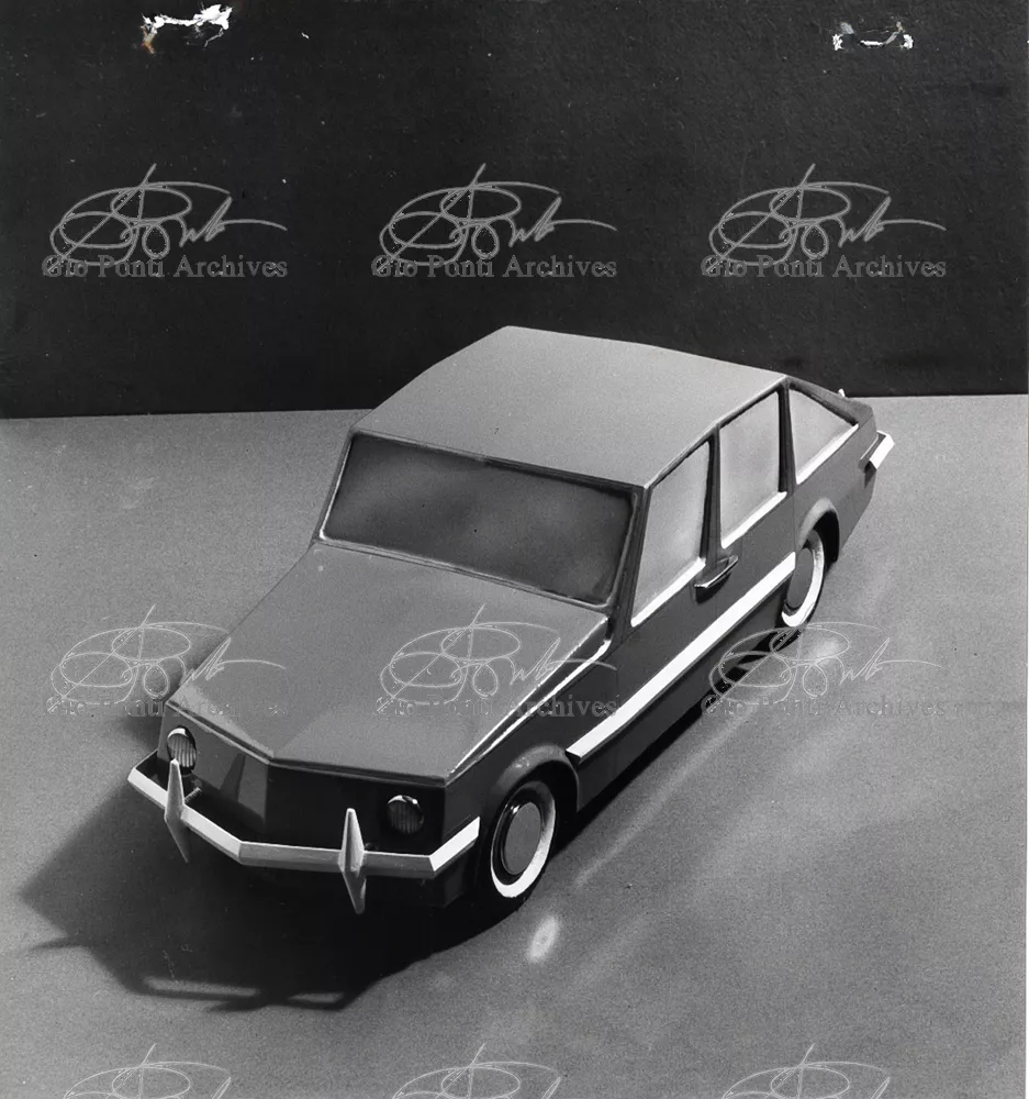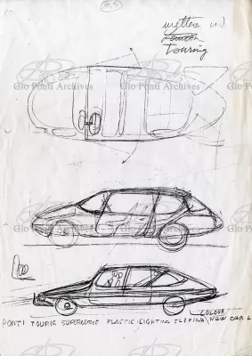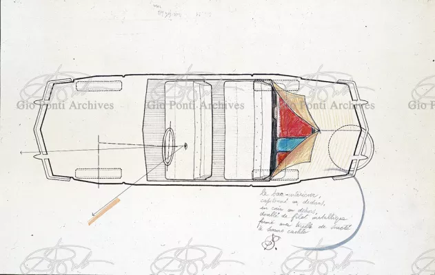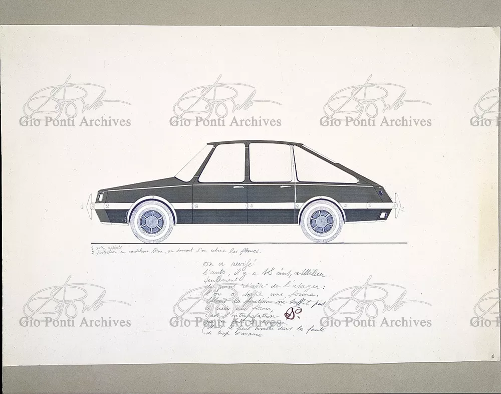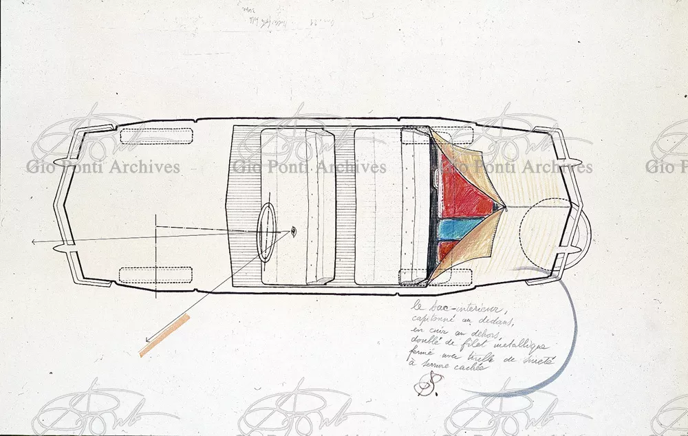 Gio Ponti had devised this form in reaction to the cars of that time, swollen, full of empty spaces, (borax, as Edgar Kaufmann used to say) with very high radiators, tiny windows, and dark interiors. It was a form ahead of its time: the body sheets are flat, not curved stiffened with folds and not ribs; the hood is low, the windows are very large, the back seats are adjustable like in airplanes, as people used to say at the time, the trunk is extremely capacious, accessible from the inside and separate from the spare wheel housing; the interior is spacious, bright, and filled with pockets. One innovation: the bumper made of rubber (provided with spring buffers at front and rear) that runs right round the car.