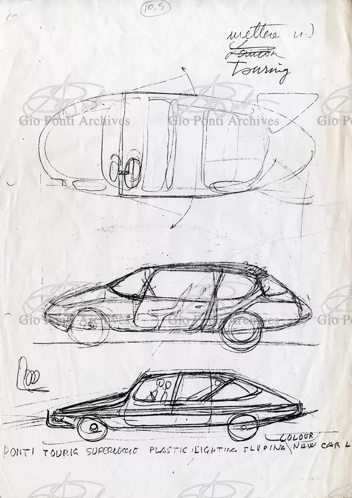 A «form for the automobile designed by Gio Ponti in 1952 for an Alfa Romeo chassis. At the time, Carrozzeria Touring did not dare to put this design for a car body into production. Twenty years later, many cars had caught up with it.