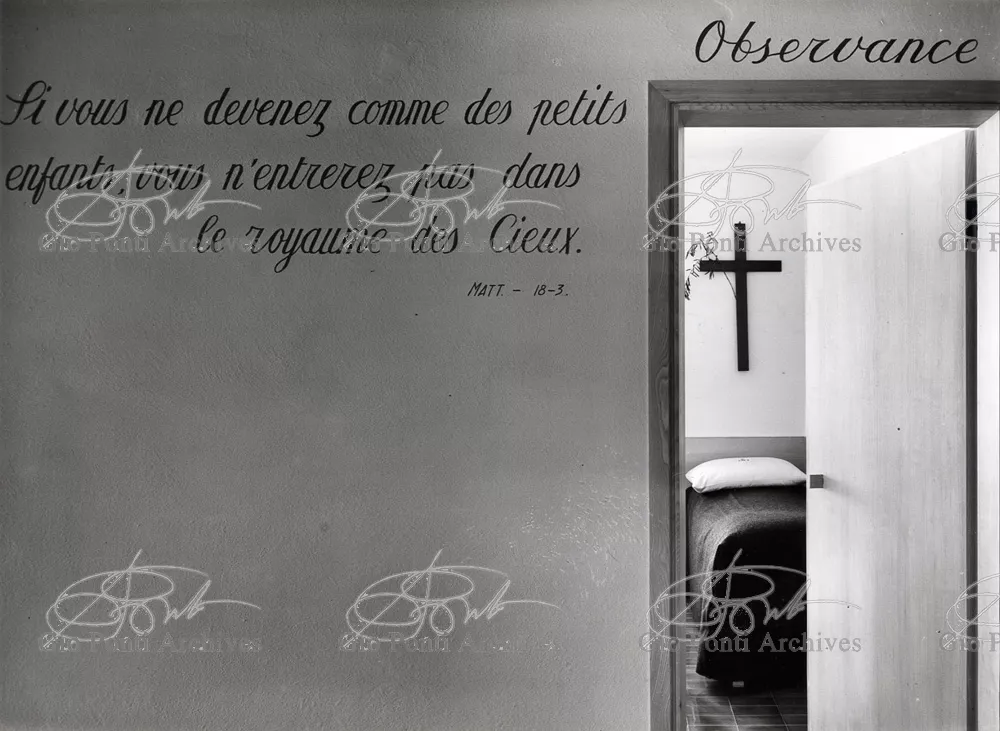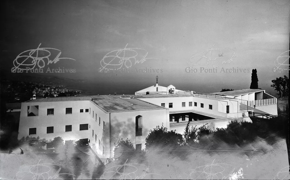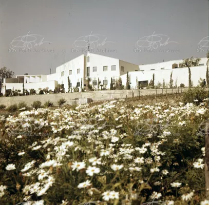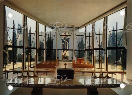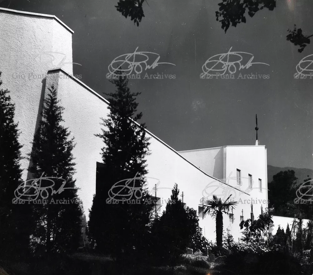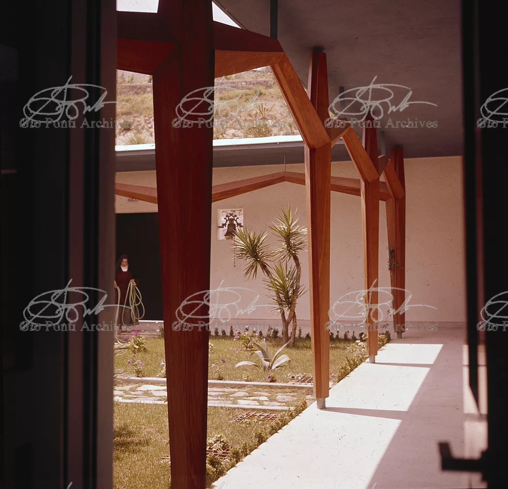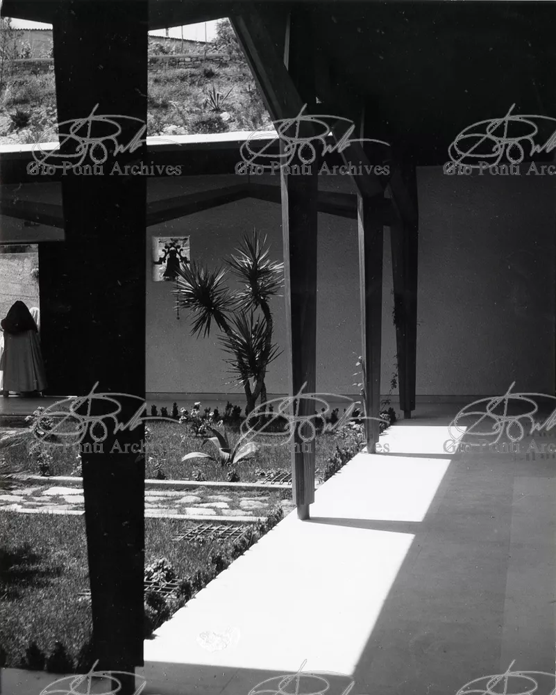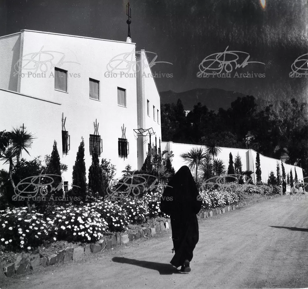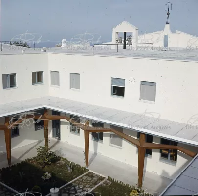 In Gio Ponti, the sacred was expressed in joy, as it was in this convent of enclosure contrasted in its day with Le Corbusier's monastery of La Tourette.The protagonists of this architecture are the white walls, in their contact with the greenery and the sky. Its heart is the chapel; transparent/non-transparent, it is set just between the outside world» and the convent. It does not have walls but screens. From the outside it looks closed, from the inside, open: open to an outside world of flowers and greenery, but one that is in turn enclosed, surrounded by a wall - the parvis. The cloister forms another heart: it is at the centre of the convent, with no more transparency, and its portico has light wooden crosses as columns. The wood leads to the interiors: in the cells, the refectory, and the choir, there is nothing but wood and white walls. The three years required to carry out this work made possible a unique (and never forgotten) debate between the nuns and the architect over what is a convent and what is architecture. It was the architect who said, to the Carmelites de Saint Elie: building a convent is not an architectural problem, but a religious one. And it was the nuns who, on Le Corbusier's death, had a Mess celebrated for him in the chapel of their convent. The project was by Gio Ponti and Antonio Fornaroli.