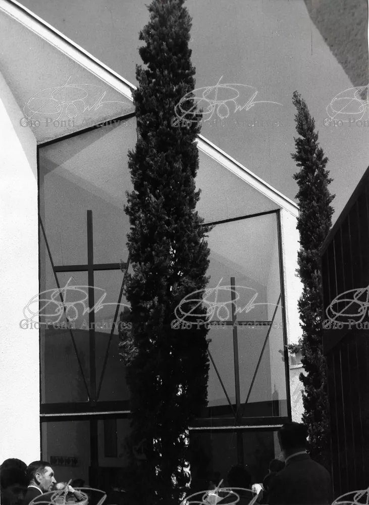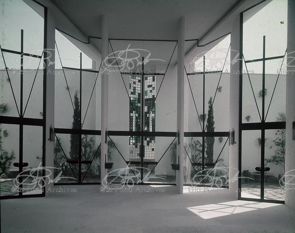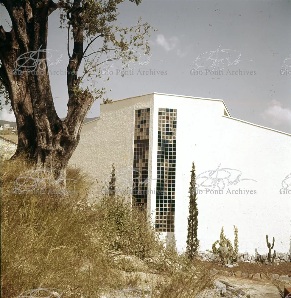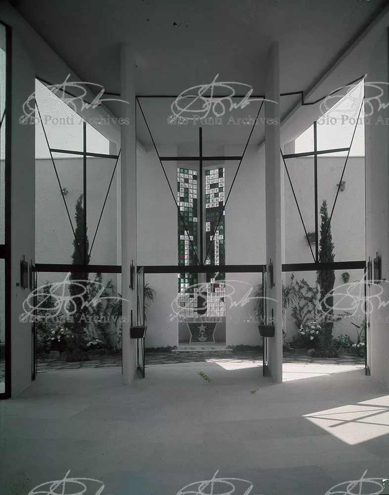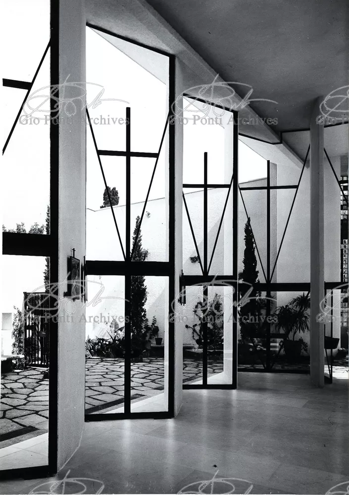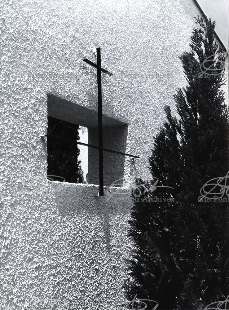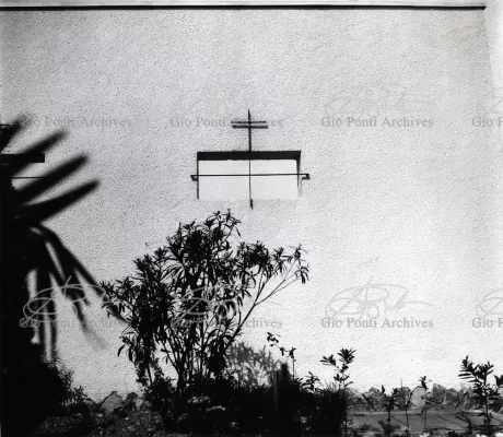 In Gio Ponti, the sacred was expressed in joy, as it was in this convent of enclosure contrasted in its day with Le Corbusier's monastery of La Tourette.The protagonists of this architecture are the white walls, in their contact with the greenery and the sky. Its heart is the chapel; transparent/non-transparent, it is set just between the outside world» and the convent. It does not have walls but screens. From the outside it looks closed, from the inside, open: open to an outside world of flowers and greenery, but one that is in turn enclosed, surrounded by a wall - the parvis. The cloister forms another heart: it is at the centre of the convent, with no more transparency, and its portico has light wooden crosses as columns. The wood leads to the interiors: in the cells, the refectory, and the choir, there is nothing but wood and white walls. The three years required to carry out this work made possible a unique (and never forgotten) debate between the nuns and the architect over what is a convent and what is architecture. It was the architect who said, to the Carmelites de Saint Elie: building a convent is not an architectural problem, but a religious one. And it was the nuns who, on Le Corbusier's death, had a Mess celebrated for him in the chapel of their convent. The project was by Gio Ponti and Antonio Fornaroli.