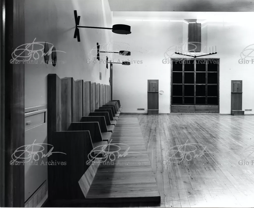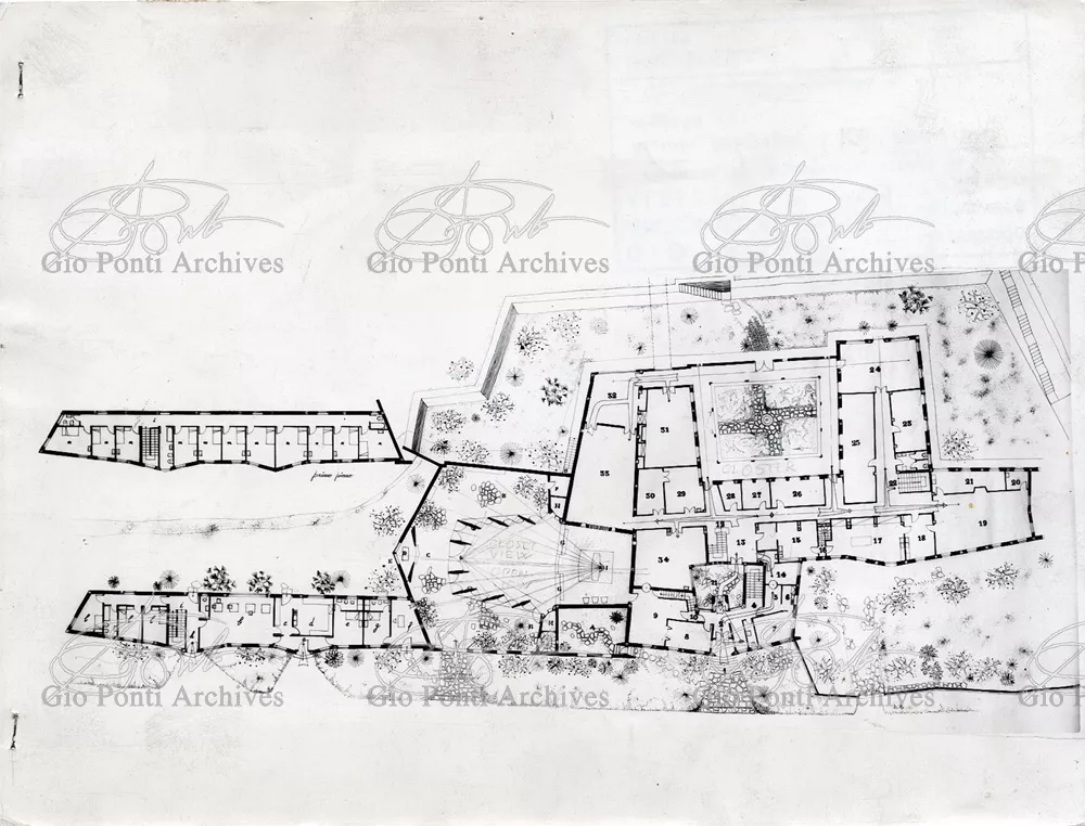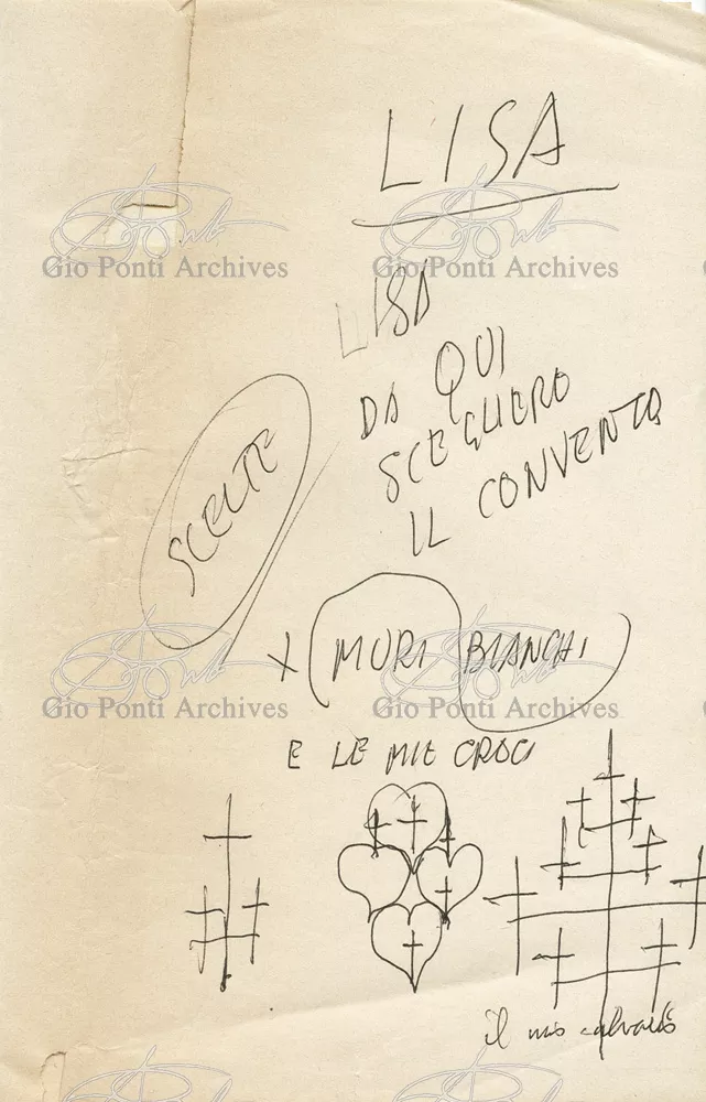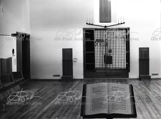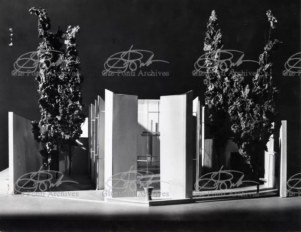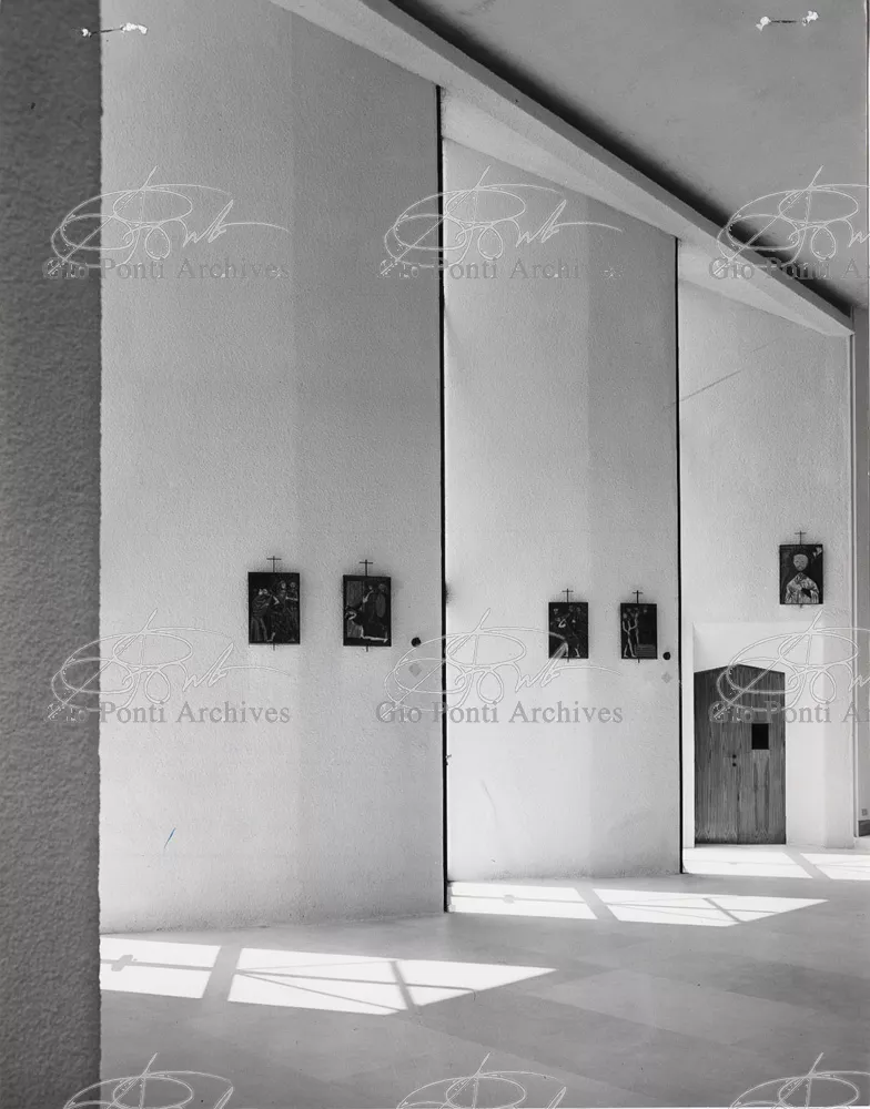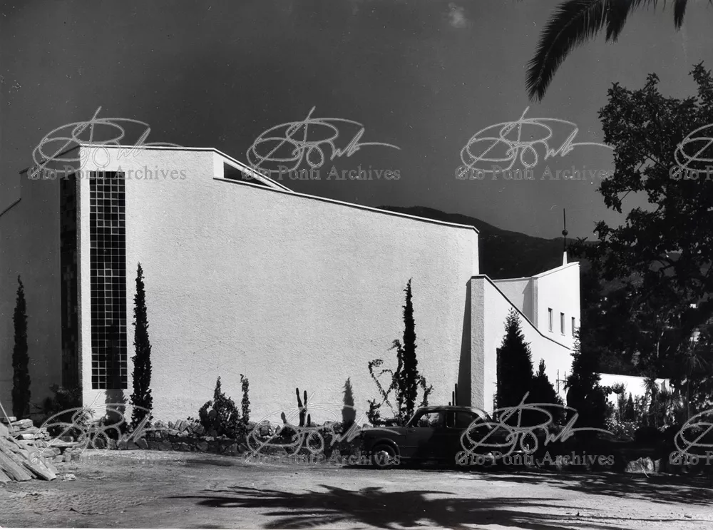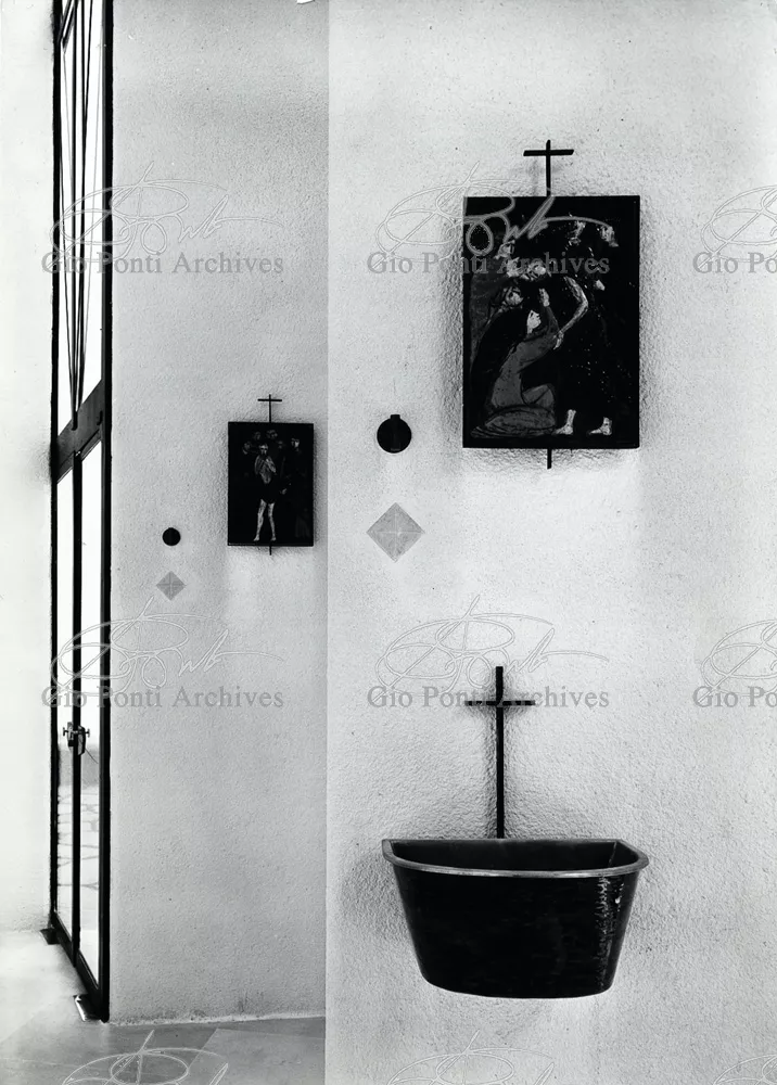 In Gio Ponti, the sacred was expressed in joy, as it was in this convent of enclosure contrasted in its day with Le Corbusier's monastery of La Tourette.The protagonists of this architecture are the white walls, in their contact with the greenery and the sky. Its heart is the chapel; transparent/non-transparent, it is set just between the outside world» and the convent. It does not have walls but screens. From the outside it looks closed, from the inside, open: open to an outside world of flowers and greenery, but one that is in turn enclosed, surrounded by a wall - the parvis. The cloister forms another heart: it is at the centre of the convent, with no more transparency, and its portico has light wooden crosses as columns. The wood leads to the interiors: in the cells, the refectory, and the choir, there is nothing but wood and white walls. The three years required to carry out this work made possible a unique (and never forgotten) debate between the nuns and the architect over what is a convent and what is architecture. It was the architect who said, to the Carmelites de Saint Elie: building a convent is not an architectural problem, but a religious one. And it was the nuns who, on Le Corbusier's death, had a Mess celebrated for him in the chapel of their convent. The project was by Gio Ponti and Antonio Fornaroli.