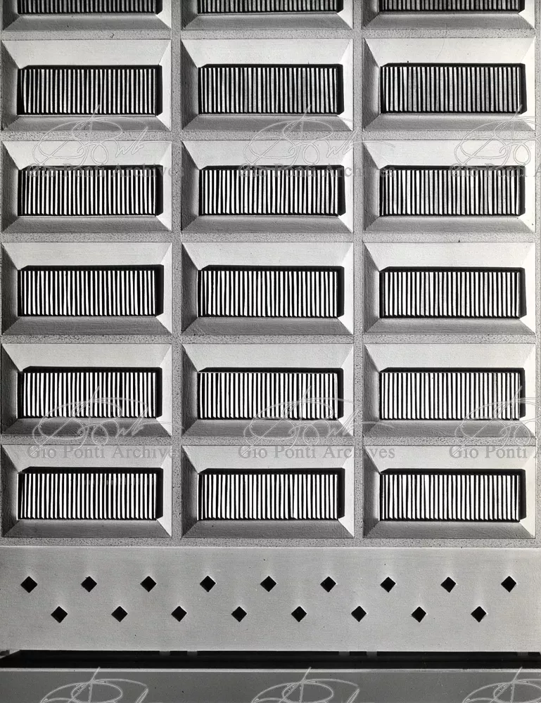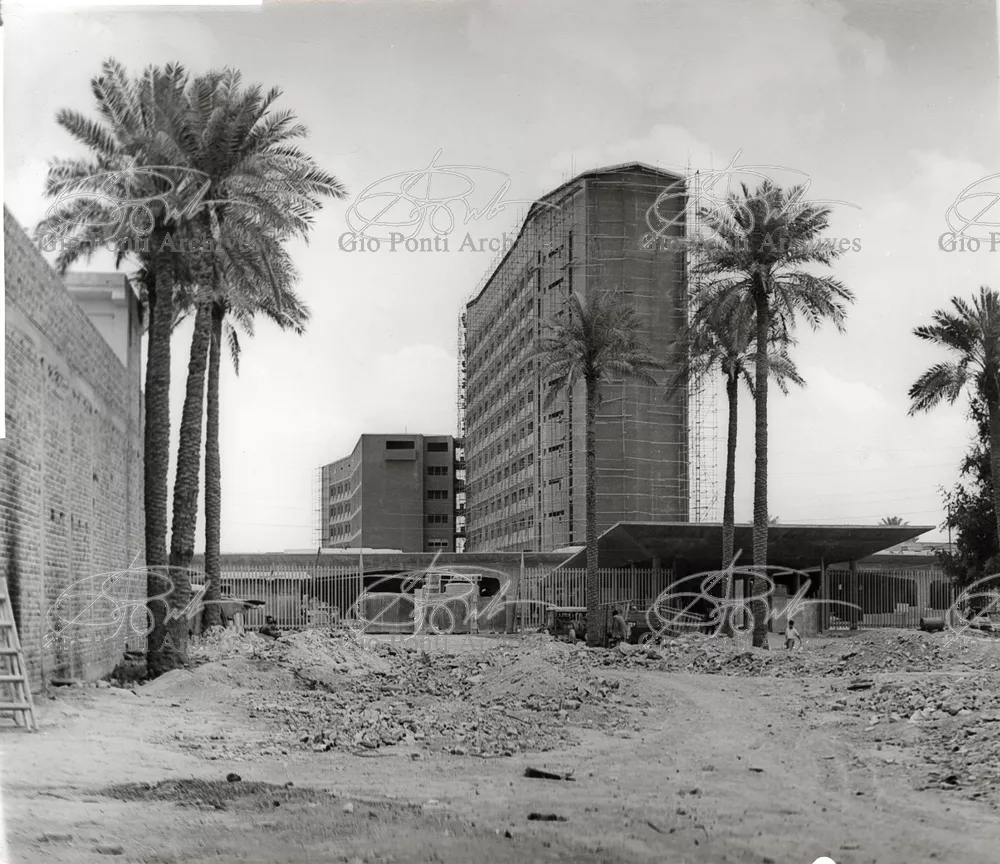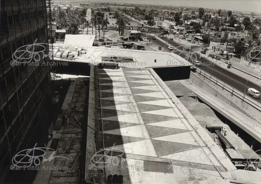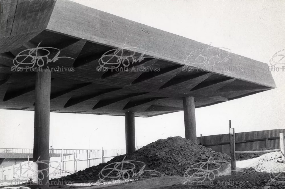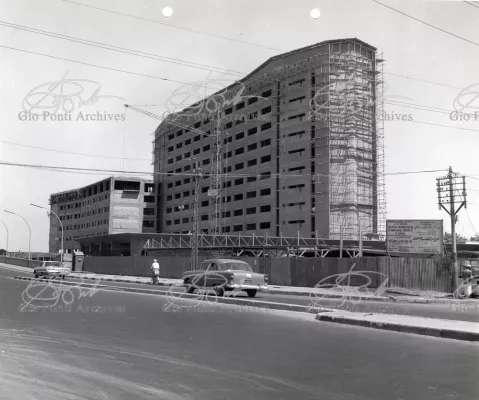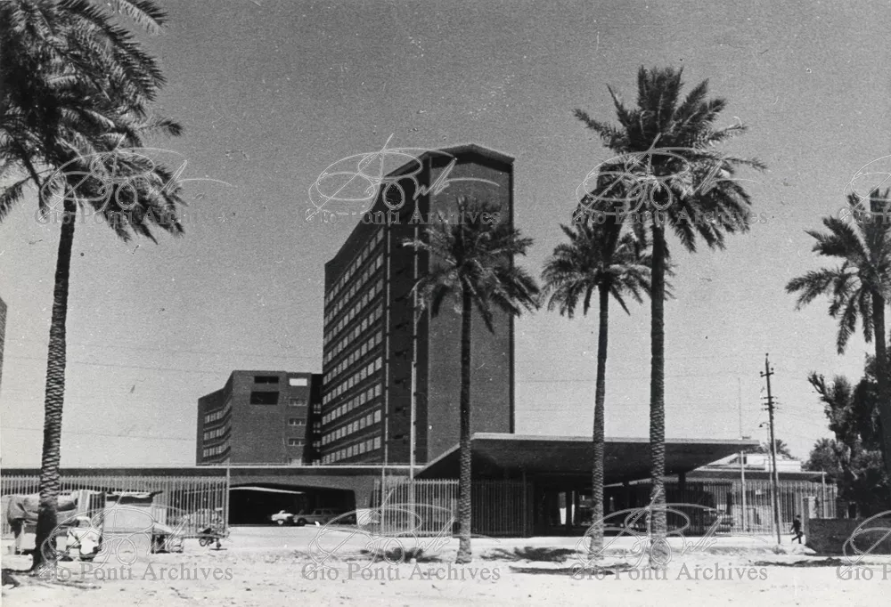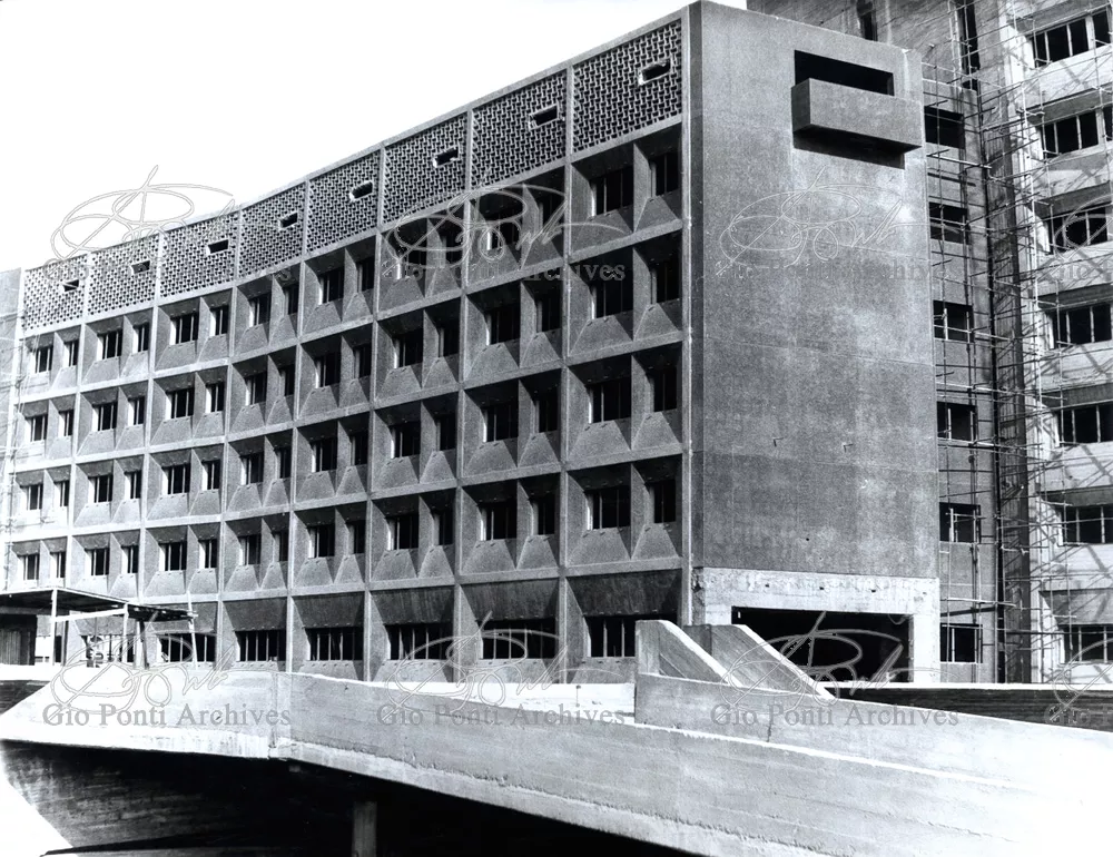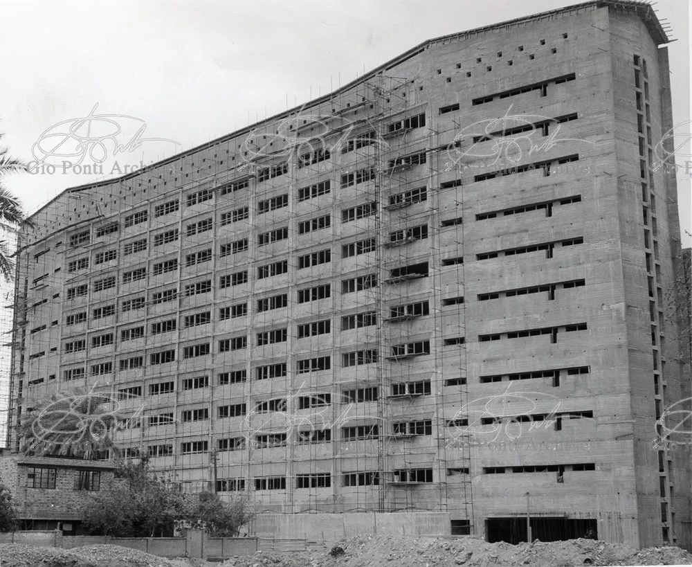 It responds, Ponti stressed, to a solely climatic environmental situation the city's architectural past has been wiped out, and this was the reason for the enormous arcade that covers almost the entire area 16,000 square meters, providing shelter for all the external routes, for both vehicles and pedestrians, and the car park. Out of the arcade rise the two blocks administrative offices, executive offices in contact with one another. The facades, clad with gray-blue ceramic tiles, have movable aluminium brise-soleils.