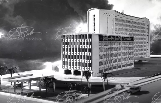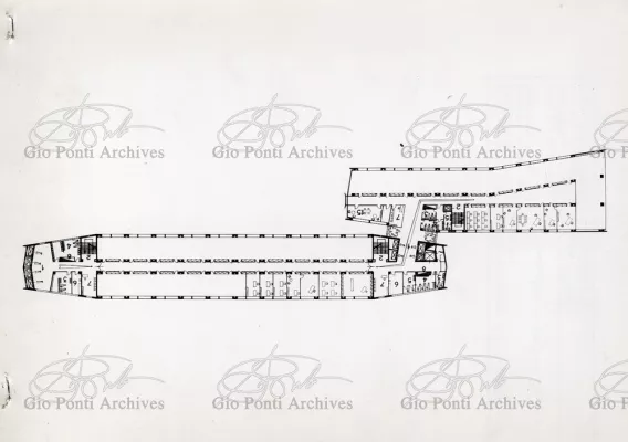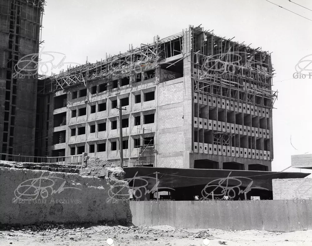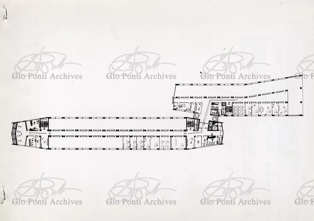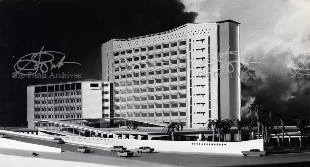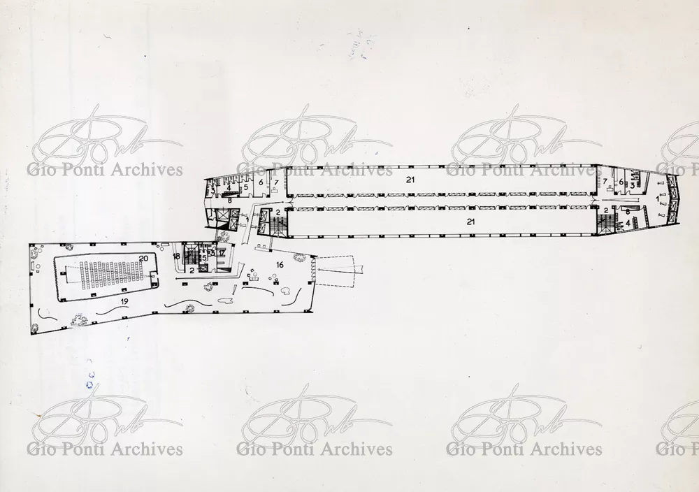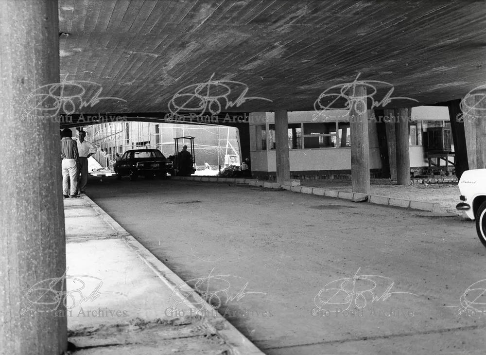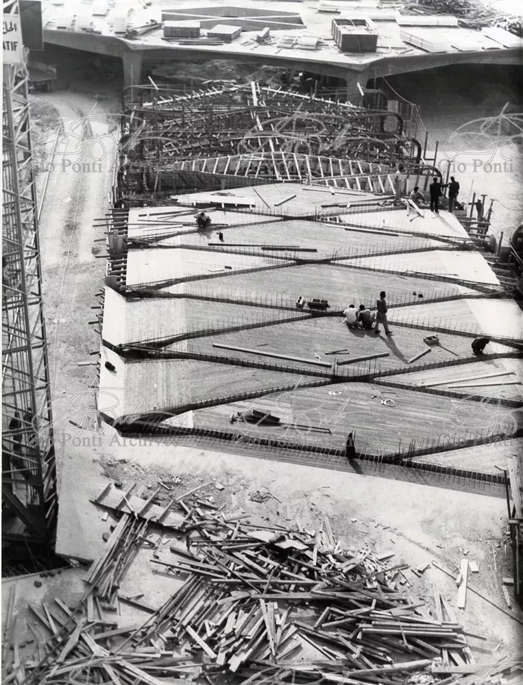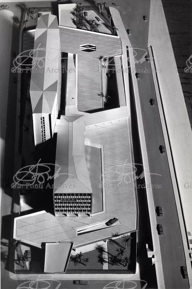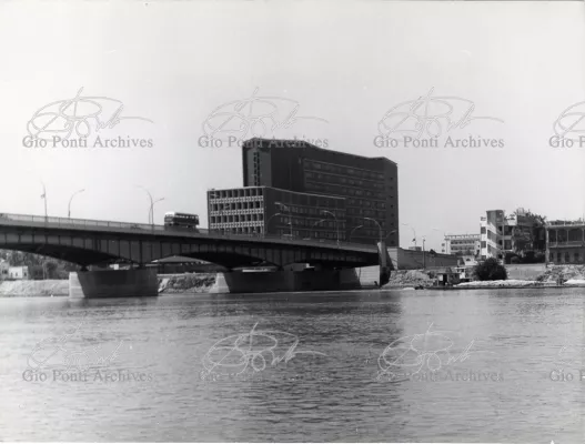 It responds, Ponti stressed, to a solely climatic environmental situation the city's architectural past has been wiped out, and this was the reason for the enormous arcade that covers almost the entire area 16,000 square meters, providing shelter for all the external routes, for both vehicles and pedestrians, and the car park. Out of the arcade rise the two blocks administrative offices, executive offices in contact with one another. The facades, clad with gray-blue ceramic tiles, have movable aluminium brise-soleils.