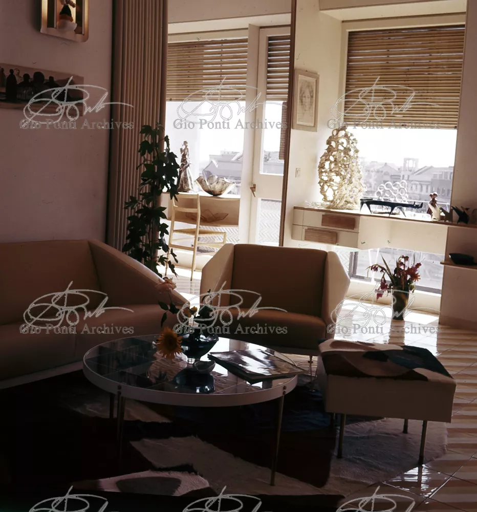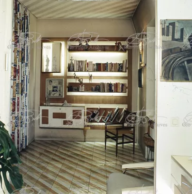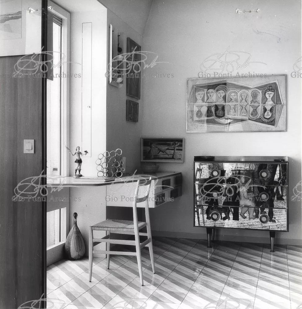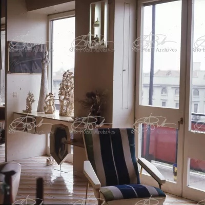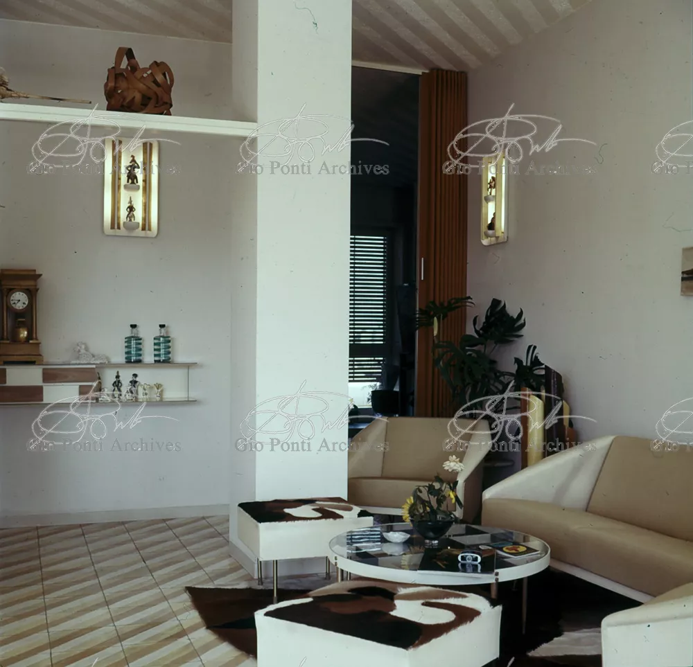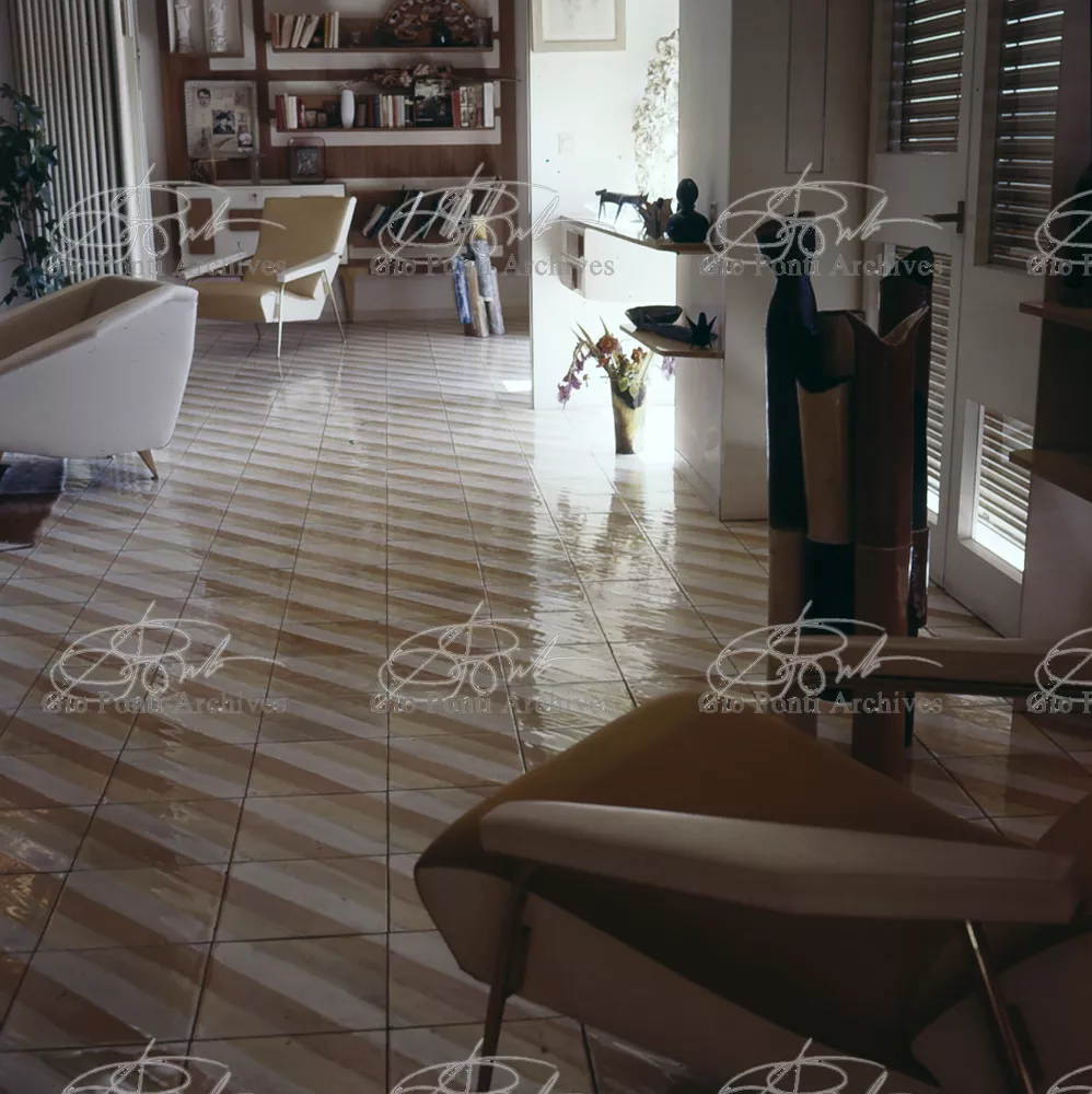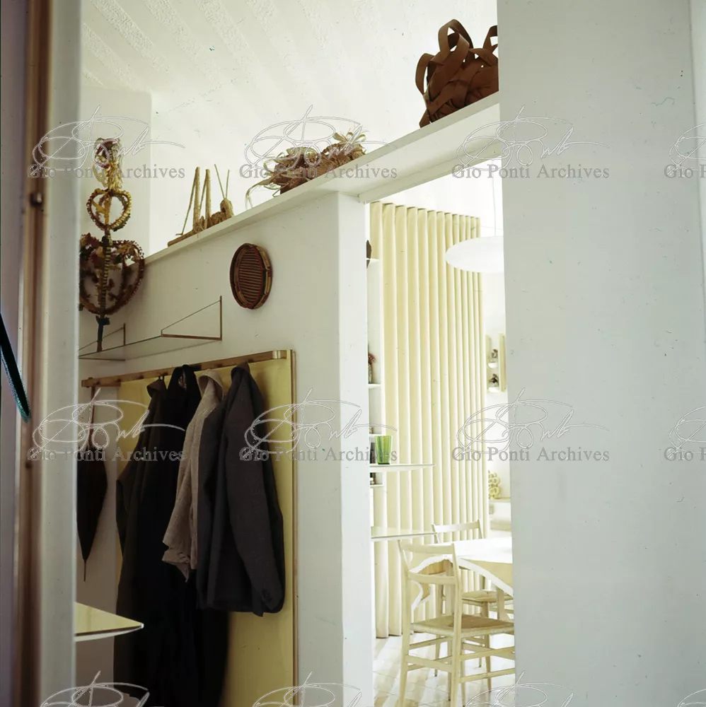 The apartment in which Gio Ponti lived, with his family, from 1957 onward (his last house), contains all of the Pontian inventions with regard to layout, walls, furniture, and objects that had appeared during the fifties, and that had originated even earlier. Here they are brought together, for the first time, in a unit and for real: from the open space with sliding walls to the furnished windows, self illuminating furniture, organized wall panels, diagonally striped floor and ceiling, single colour scheme here, white and yellow, identical chairs and beds for the entire apartment, and paintings placed on stands instead of hung on the walls. A demonstration house. And one in which everything came from the same mind and hand.And then the demonstration changed as Ponti's thinking about the house progressed. This highly liveable open space for five people turned into something else when Ponti lived there on his own: a free space in which to roam, amidst growing piles of drawings and paintings. Paintings on perspex too, an idea that Ponti came up with toward the end of his life, paintings to be looked at against the light, like stained-glass windows. At the age of eighty-six, Ponti painted twenty large angels on perspex,and thought about making, with this window painting displayed on every floor, a movable decoration for the whole facade of the apartment building -he was always thinking in festive terms, residents permitting. The facade would have allowed this: a facade of superimposed bands, in which, on every floor, the residents had been allowed to choose their own «outside colour, and even their own pattern of windows. Almost spontaneous architecture, Ponti used to say.