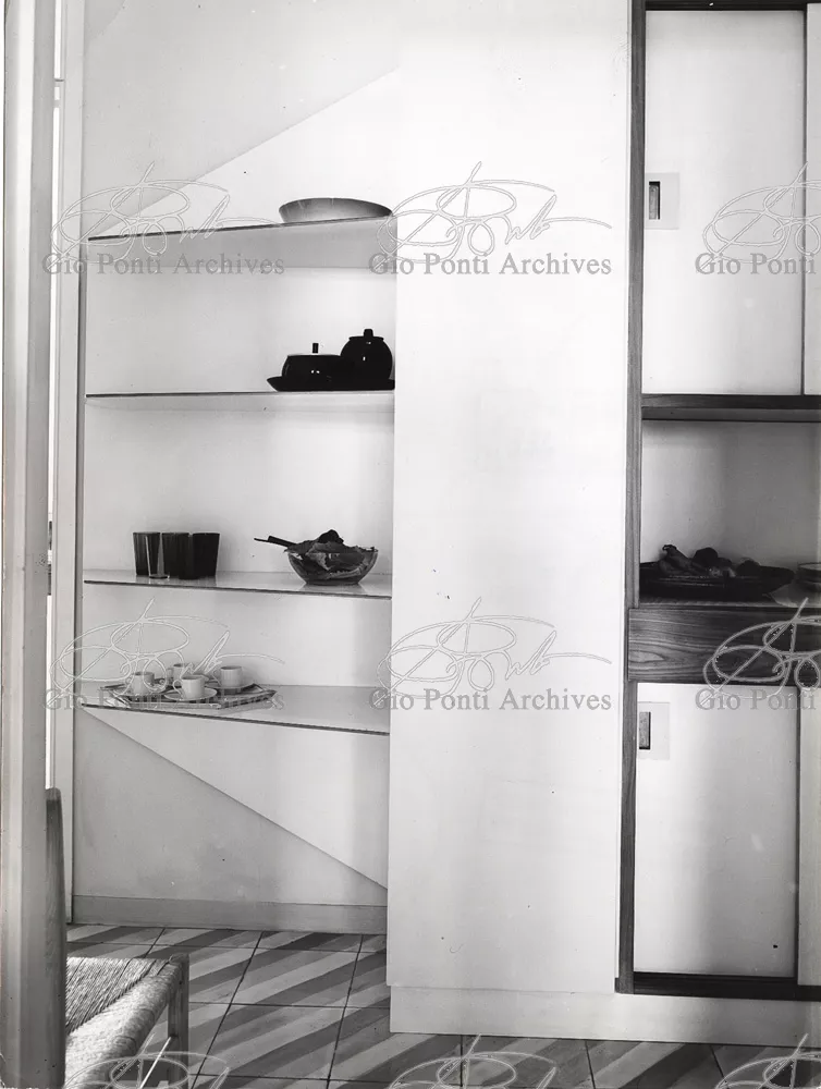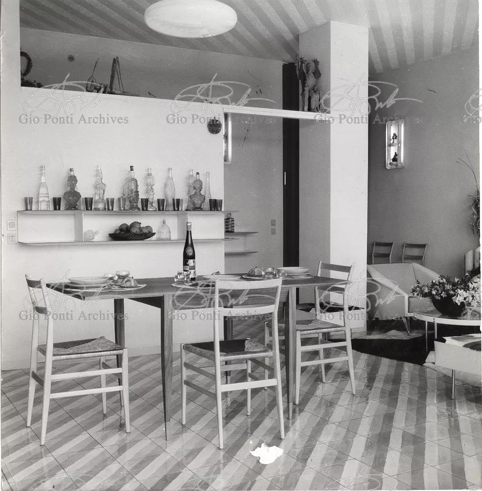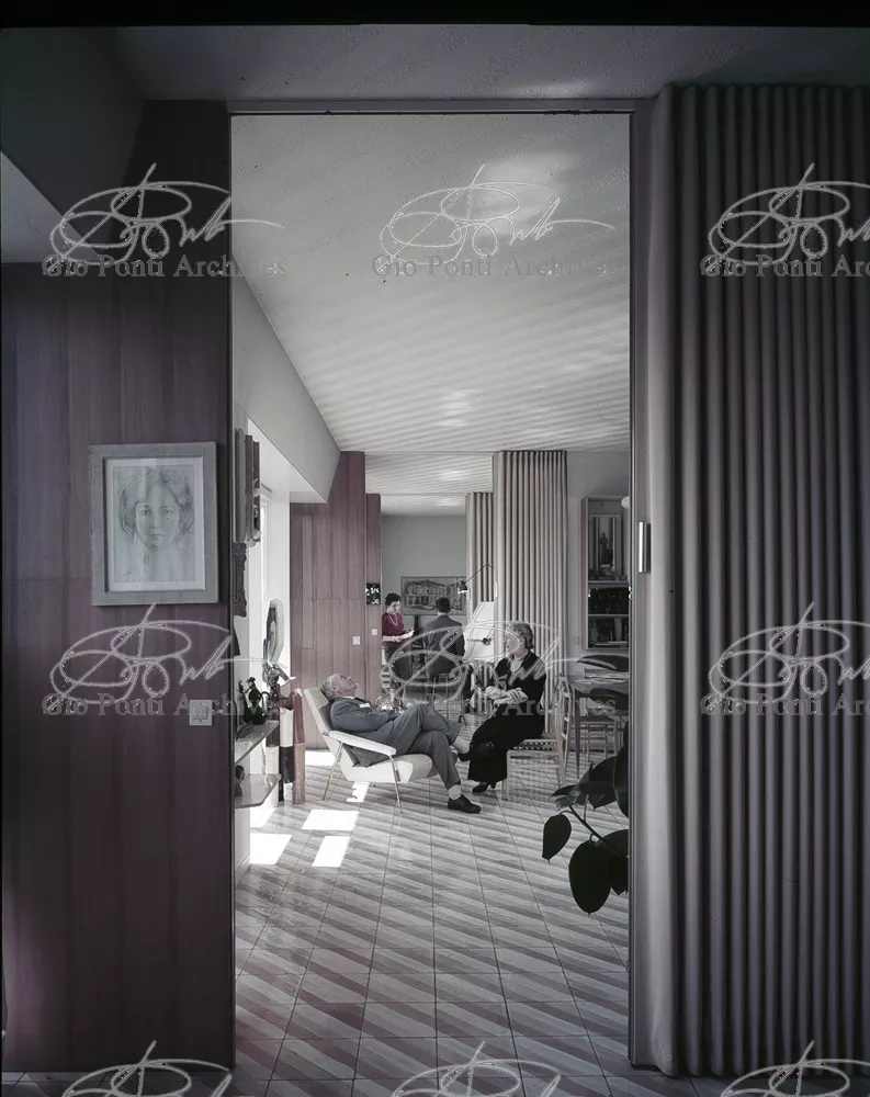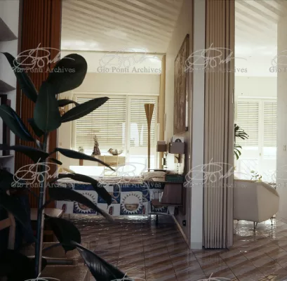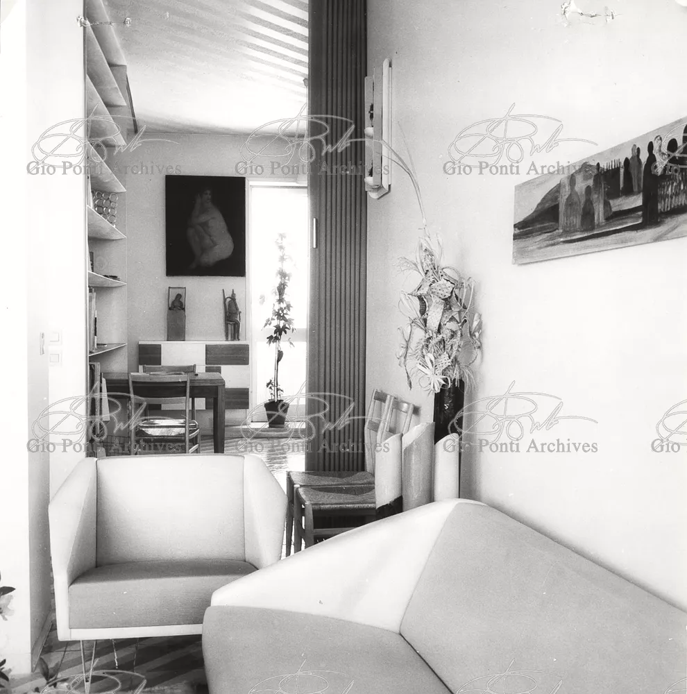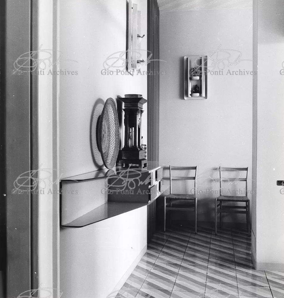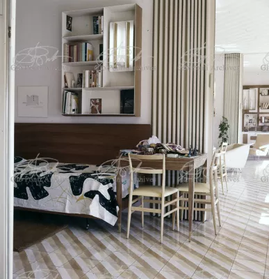 The apartment in which Gio Ponti lived, with his family, from 1957 onward (his last house), contains all of the Pontian inventions with regard to layout, walls, furniture, and objects that had appeared during the fifties, and that had originated even earlier. Here they are brought together, for the first time, in a unit and for real: from the open space with sliding walls to the furnished windows, self illuminating furniture, organized wall panels, diagonally striped floor and ceiling, single colour scheme here, white and yellow, identical chairs and beds for the entire apartment, and paintings placed on stands instead of hung on the walls. A demonstration house. And one in which everything came from the same mind and hand.And then the demonstration changed as Ponti's thinking about the house progressed. This highly liveable open space for five people turned into something else when Ponti lived there on his own: a free space in which to roam, amidst growing piles of drawings and paintings. Paintings on perspex too, an idea that Ponti came up with toward the end of his life, paintings to be looked at against the light, like stained-glass windows. At the age of eighty-six, Ponti painted twenty large angels on perspex,and thought about making, with this window painting displayed on every floor, a movable decoration for the whole facade of the apartment building -he was always thinking in festive terms, residents permitting. The facade would have allowed this: a facade of superimposed bands, in which, on every floor, the residents had been allowed to choose their own «outside colour, and even their own pattern of windows. Almost spontaneous architecture, Ponti used to say.