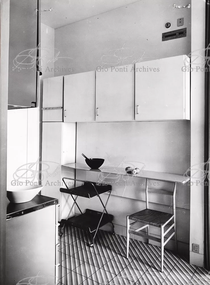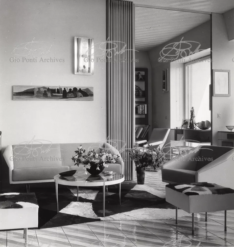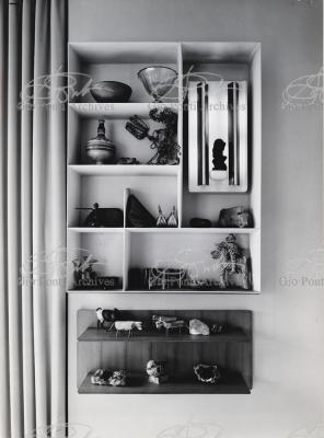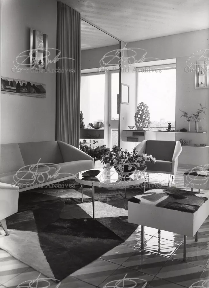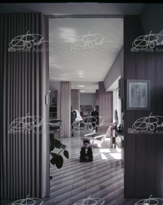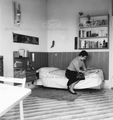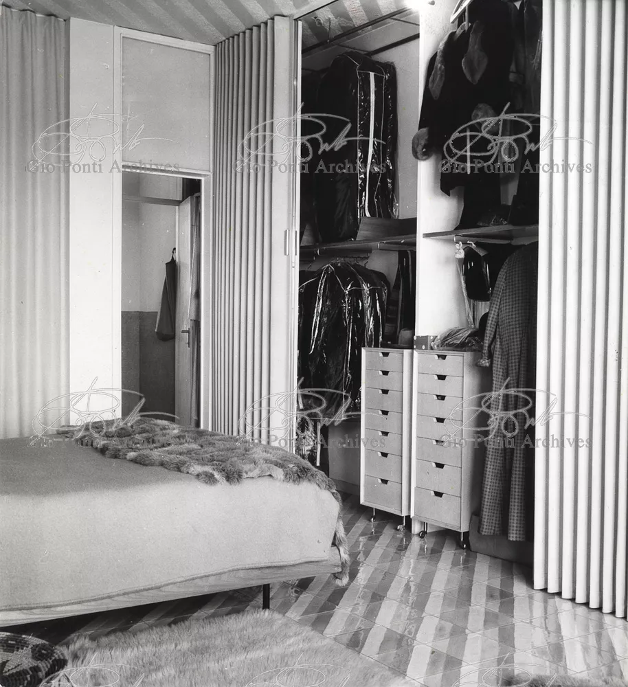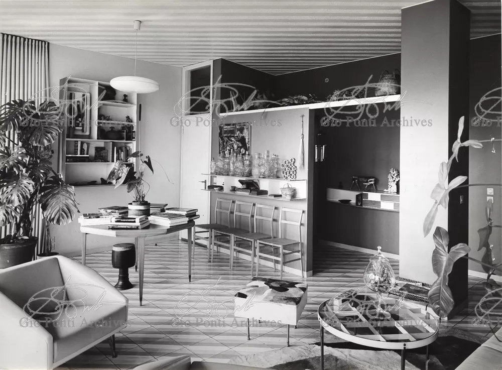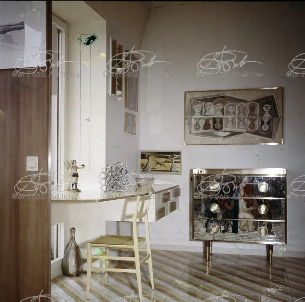 The apartment in which Gio Ponti lived, with his family, from 1957 onward (his last house), contains all of the Pontian inventions with regard to layout, walls, furniture, and objects that had appeared during the fifties, and that had originated even earlier. Here they are brought together, for the first time, in a unit and for real: from the open space with sliding walls to the furnished windows, self illuminating furniture, organized wall panels, diagonally striped floor and ceiling, single colour scheme here, white and yellow, identical chairs and beds for the entire apartment, and paintings placed on stands instead of hung on the walls. A demonstration house. And one in which everything came from the same mind and hand.And then the demonstration changed as Ponti's thinking about the house progressed. This highly liveable open space for five people turned into something else when Ponti lived there on his own: a free space in which to roam, amidst growing piles of drawings and paintings. Paintings on perspex too, an idea that Ponti came up with toward the end of his life, paintings to be looked at against the light, like stained-glass windows. At the age of eighty-six, Ponti painted twenty large angels on perspex,and thought about making, with this window painting displayed on every floor, a movable decoration for the whole facade of the apartment building -he was always thinking in festive terms, residents permitting. The facade would have allowed this: a facade of superimposed bands, in which, on every floor, the residents had been allowed to choose their own «outside colour, and even their own pattern of windows. Almost spontaneous architecture, Ponti used to say.