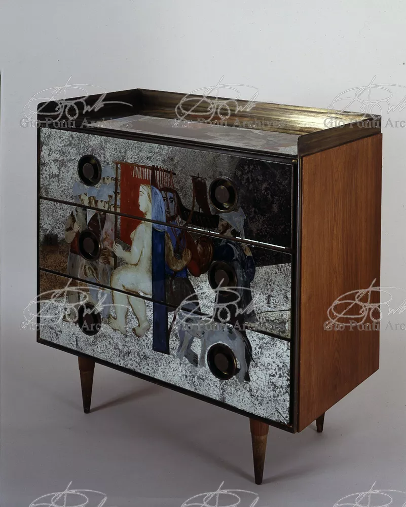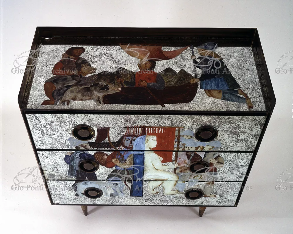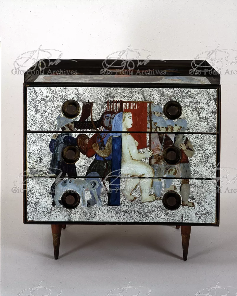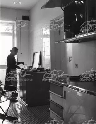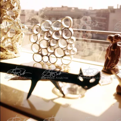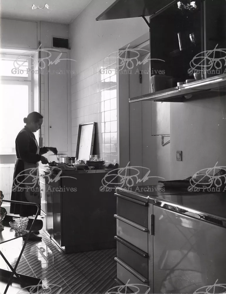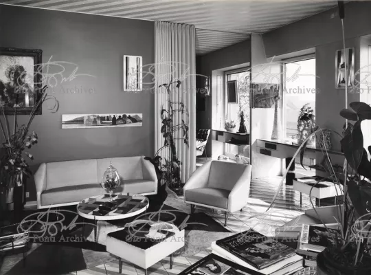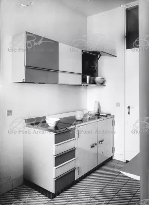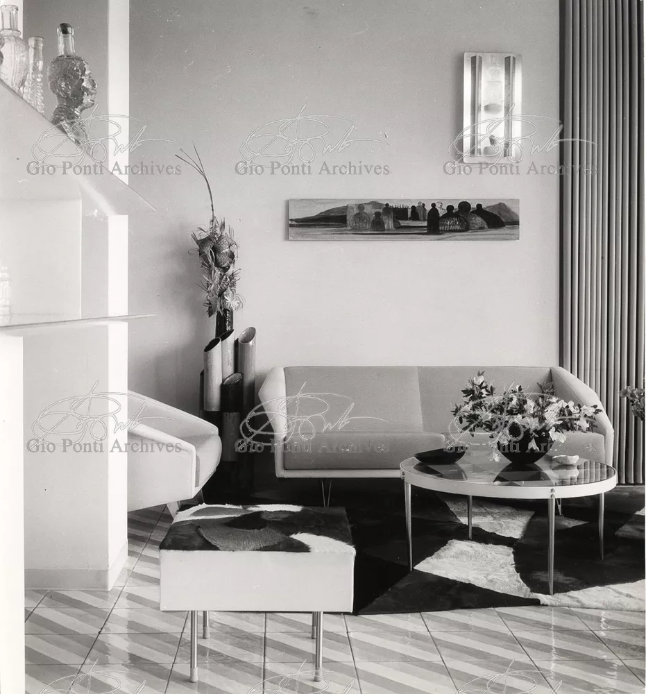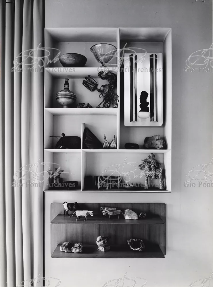 The apartment in which Gio Ponti lived, with his family, from 1957 onward (his last house), contains all of the Pontian inventions with regard to layout, walls, furniture, and objects that had appeared during the fifties, and that had originated even earlier. Here they are brought together, for the first time, in a unit and for real: from the open space with sliding walls to the furnished windows, self illuminating furniture, organized wall panels, diagonally striped floor and ceiling, single colour scheme here, white and yellow, identical chairs and beds for the entire apartment, and paintings placed on stands instead of hung on the walls. A demonstration house. And one in which everything came from the same mind and hand.And then the demonstration changed as Ponti's thinking about the house progressed. This highly liveable open space for five people turned into something else when Ponti lived there on his own: a free space in which to roam, amidst growing piles of drawings and paintings. Paintings on perspex too, an idea that Ponti came up with toward the end of his life, paintings to be looked at against the light, like stained-glass windows. At the age of eighty-six, Ponti painted twenty large angels on perspex,and thought about making, with this window painting displayed on every floor, a movable decoration for the whole facade of the apartment building -he was always thinking in festive terms, residents permitting. The facade would have allowed this: a facade of superimposed bands, in which, on every floor, the residents had been allowed to choose their own «outside colour, and even their own pattern of windows. Almost spontaneous architecture, Ponti used to say.