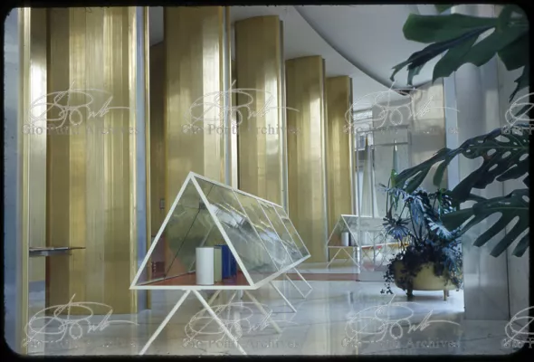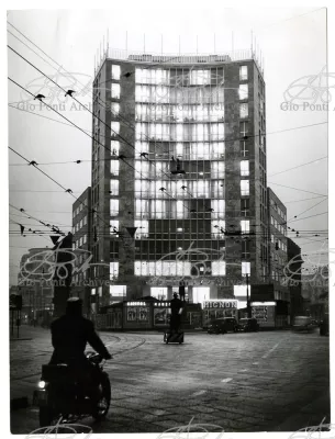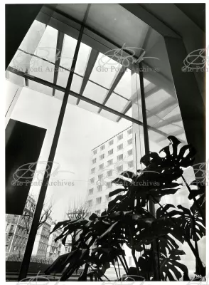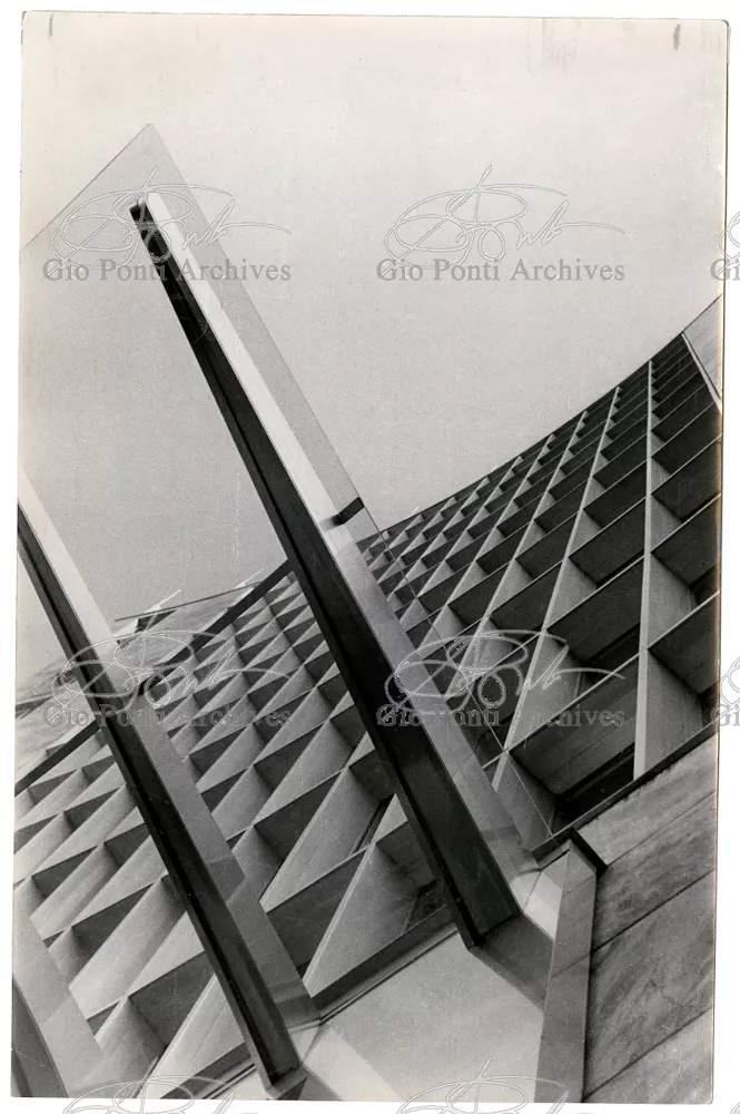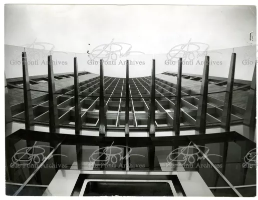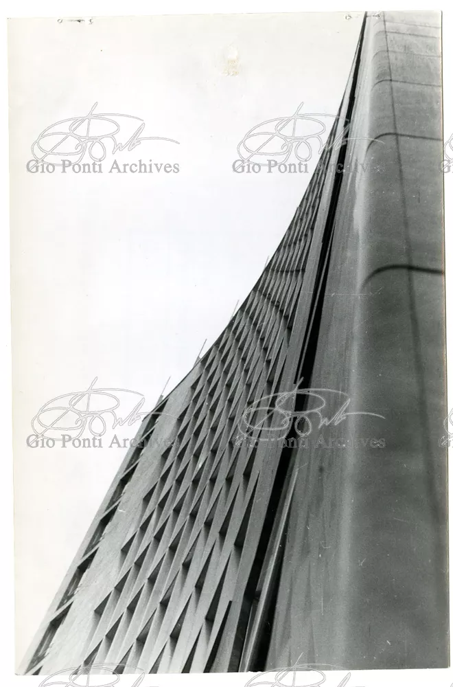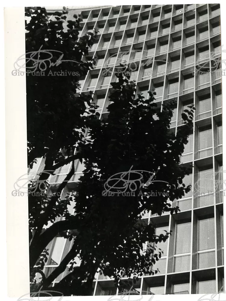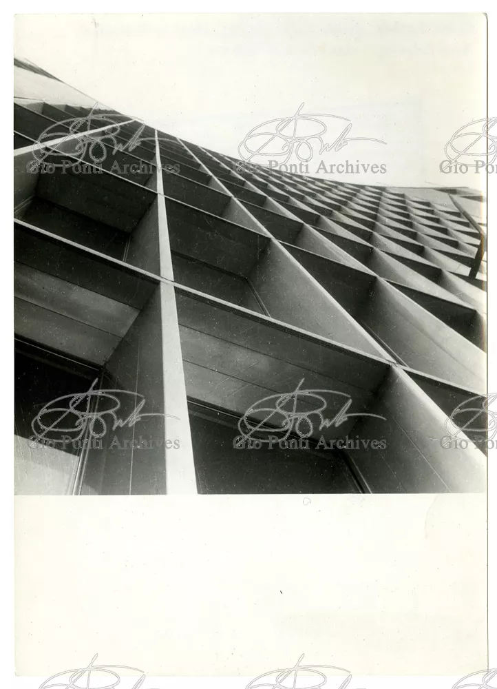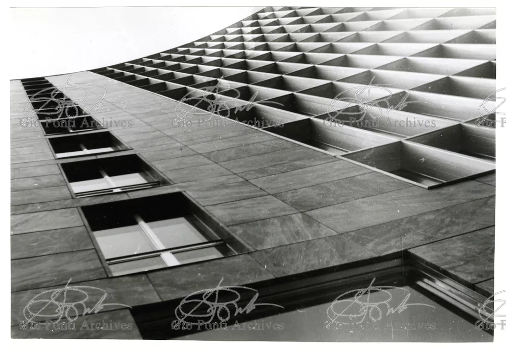 Ponti used the same solution for the wings of the second building as he did for the first. To the front he gave a contrasting design. Since this front was only slightly taller than the wings of the neighbouring building, with their strong motif, only a slender pattern extending over the whole facade could give it a different and acceptable scale. This slender pattern changes spectacularly according to the point of view of the observer, shifting from all glass frontal view to all aluminium side view. Yet in the second Montecatini building, as in the first, it is not the front that grabs your attention: here it is the back or rear facade, with its fine pattern of diamond-shaped surfaces.